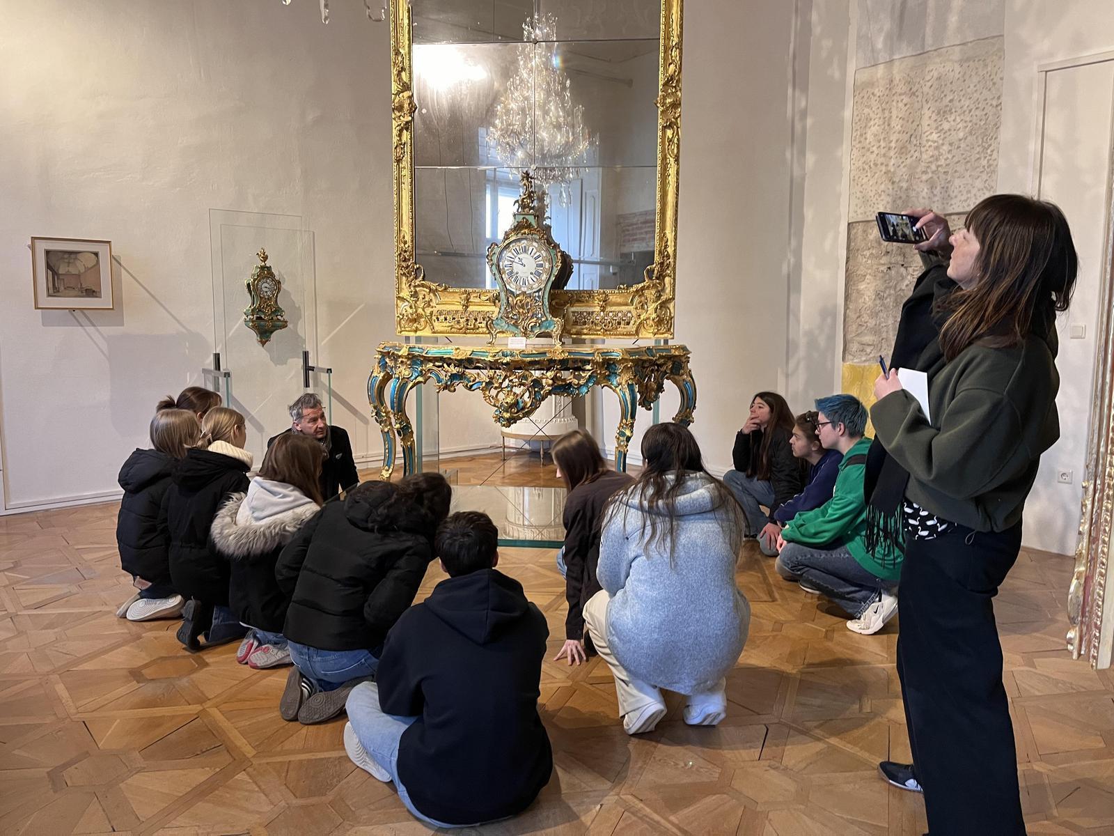Möbelstücke waren seit jeher begehrtes Gut im Hause Esterházy, sowohl mit Stücken, die als "must have" der Fürsten dienten und Gäste beeindrucken sollten, als auch als funktional-ästhetische. Sowohl im Schloss Esterházy als auch auf Burg Forchtenstein sind fantastische Möbelstücke erhalten, etwa die opulente Silbermöbelausstattung aus dem 17. Jahrhundert, aber auch schlichtere Möbel, etwa aus dem Zimmer der Kammerfrau der Fürstin. Bei einer Doppelführung, u.a. eines Kurators für zeitgenössische Kunst lernten die Schüler/innen die Ausgestaltung von Mobiliar vom 17. bis ins 21. Jahrhundert kennen. Hierbei wurde ein besonderer Fokus auf die "Lebendigkeit" der Möbel in früherer Zeit gelegt. So hatten beispielsweise Tischbeine oft die Form von Tierfüßen oder Tische waren mit Ranken, Blumen etc. geschmückt und verziert. Im Gegensatz dazu war das 20. Jahrhundert geprägt von klaren, glatten Linien, von "leblosen" Objekten, die weniger naturverbunden wirken.