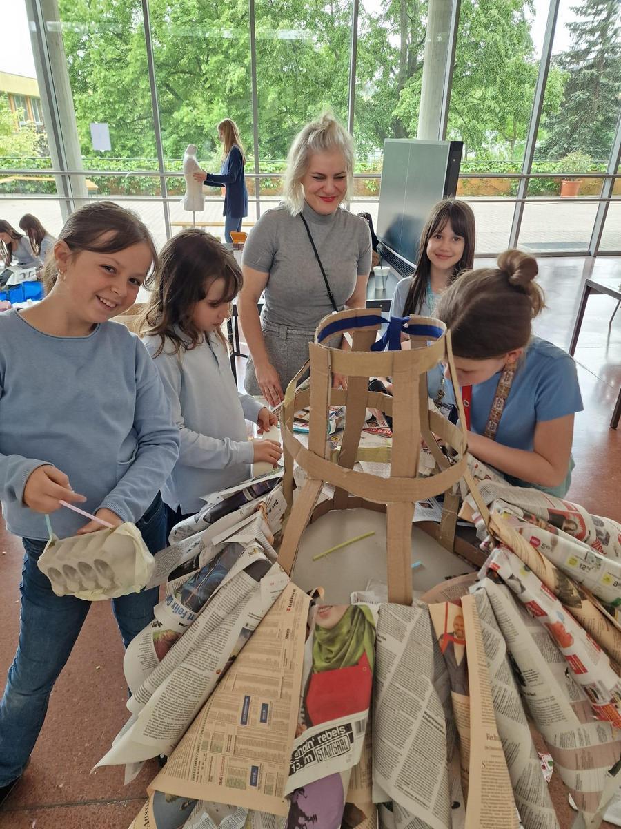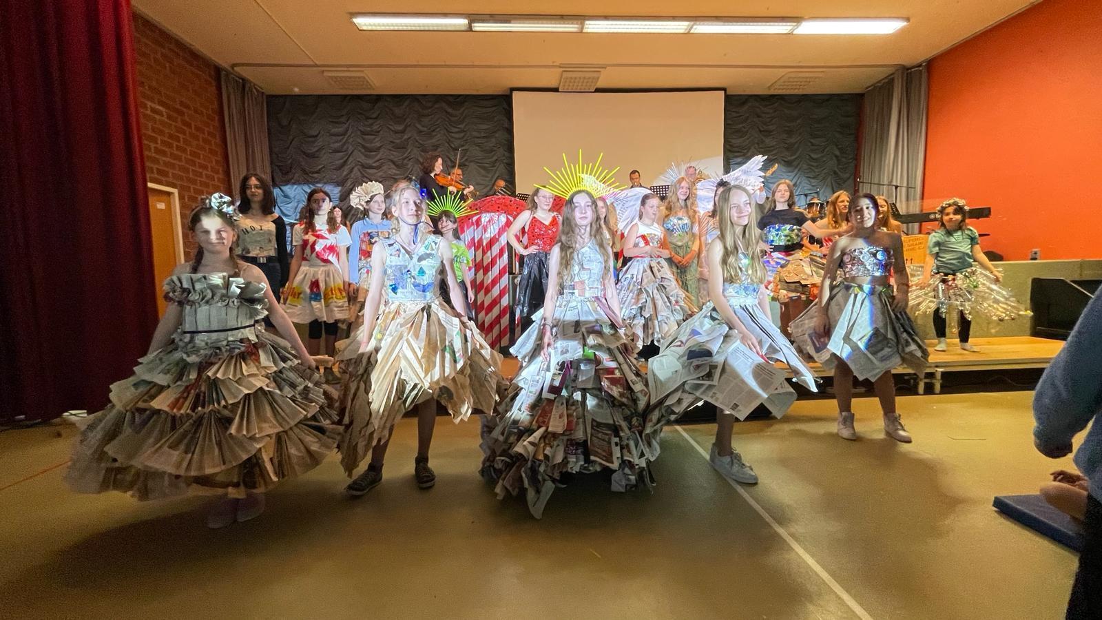 Zusätzlich gab es ein klassenübergreifendes Modeprojekt mit einer Kostümbildnerin, bei dem Kleider aus recycelten Materialien kreiert wurden. Dabei erstellten etwa 20 Schülerinnen an zwei Nachmittagen gemeinsam 20 Kleider. Die Schüler/innen, die auf der Bühne sprechen würden, bekamen außerdem ein Moderationscoaching von einer Schauspielerin, die mit ihnen Übungen zur Bühnenpräsenz machte und dann konkret an den einzelnen Sprechtexten arbeitete.