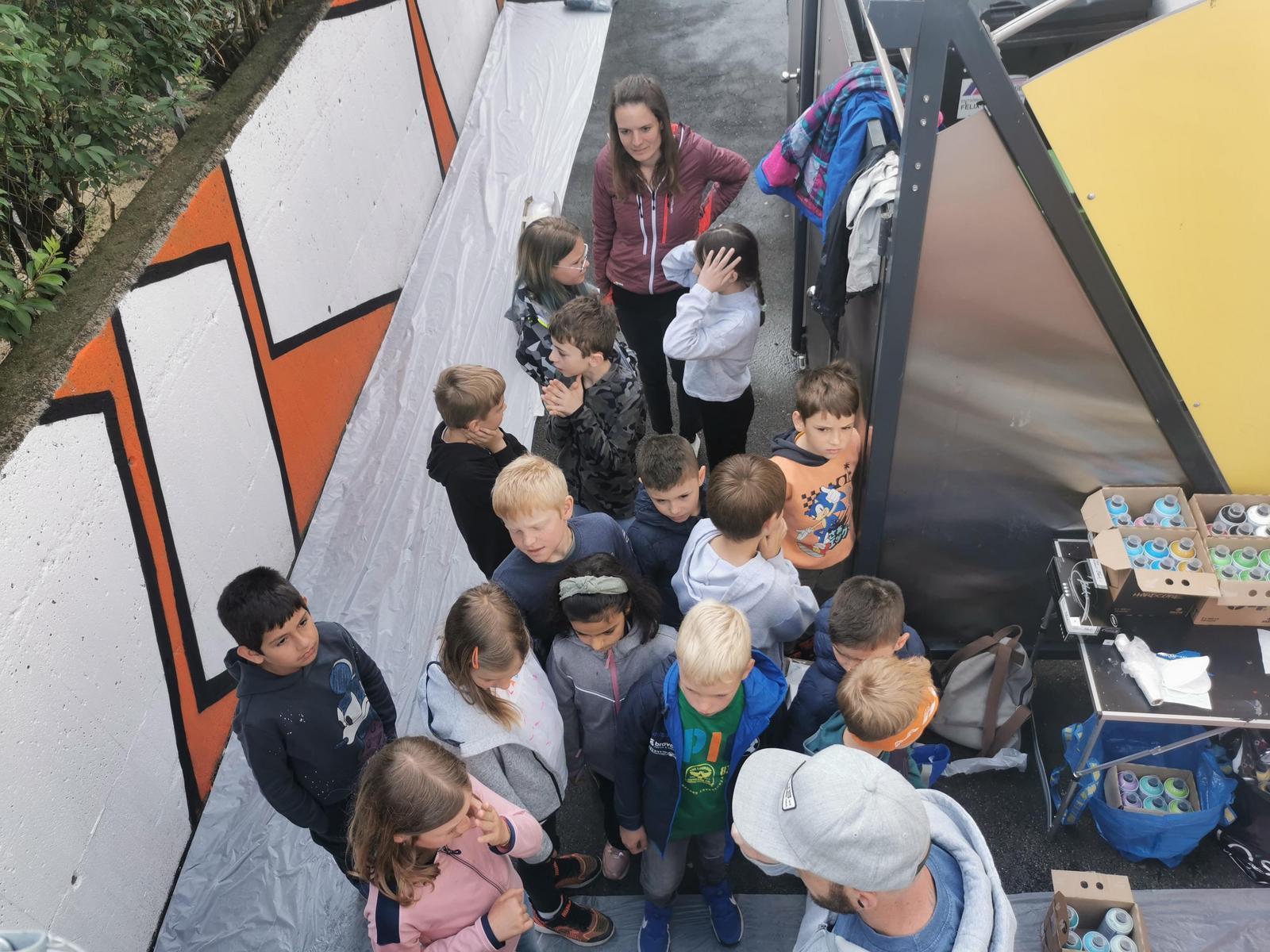 Letztes Jahr haben wir das alte Schulhaus im Rahmen von unserem Jubiläumsfest mit den Schülern künstlerisch gestaltet. Daraus entstand die Idee auch das Ausweichquartier wieder in Farbe zu kleiden, diesmal aber mit konzeptioneller Vorarbeit der Schüler/innen. 35 Kinder der 3ten Klassen nahmen am Workshop teil.