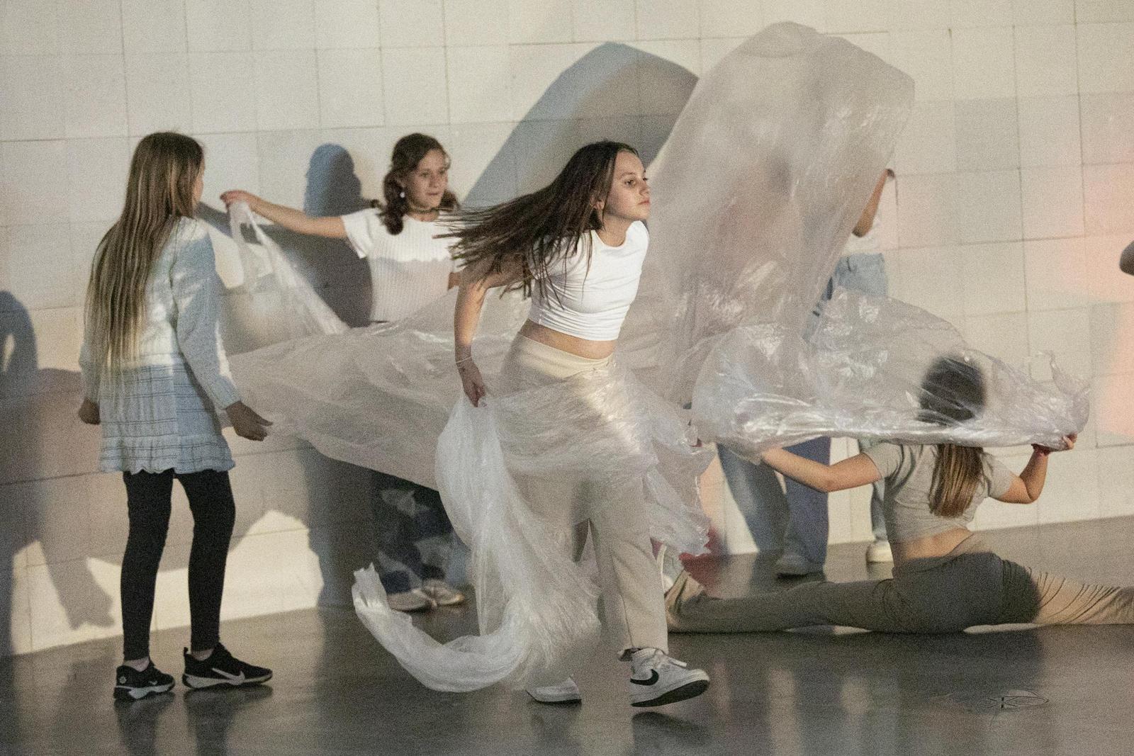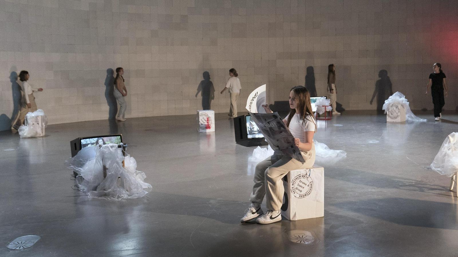 Tanz im Kunst-Raum: Der Kunst-Raum wird zur Bühne. Das monumentale Werk von Sol LeWitt wurde durch künstlerische Intervention tänzerisch in Szene gesetzt.