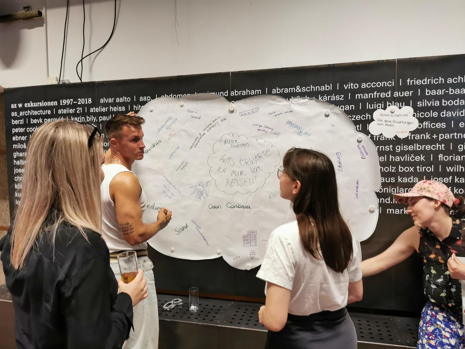 Anlässlich der Ausstellung "Über Tourismus" im Architekturzentrum Wien beschäftigten wir uns gemeinsam mit den Schülerinnen und Schülern der Hertha Firnberg Schulen für Wirtschaft und Tourismus ausgiebig mit den Folgen des Tourismus, der Rolle der Architektur in diesem Kontext und dem Image Wiens aus touristischer Sicht. Den Auftakt stellte ein Workshop in der Ausstellung dar, in dem wir zentrale Aspekte des Tourismus wie Mobilität, Städtetourismus, Klimawandel und die Privatisierung von Naturschönheiten beleuchteten und anhand von Best Practice-Beispielen zeigten, wie ein Tourismus aussehen kann, der nicht zerstört, wovon er lebt. Außerdem erforschten die Jugendlichen, wie mittels Social Media Werbung gemacht wird und womit Wien sich dort darstellt.