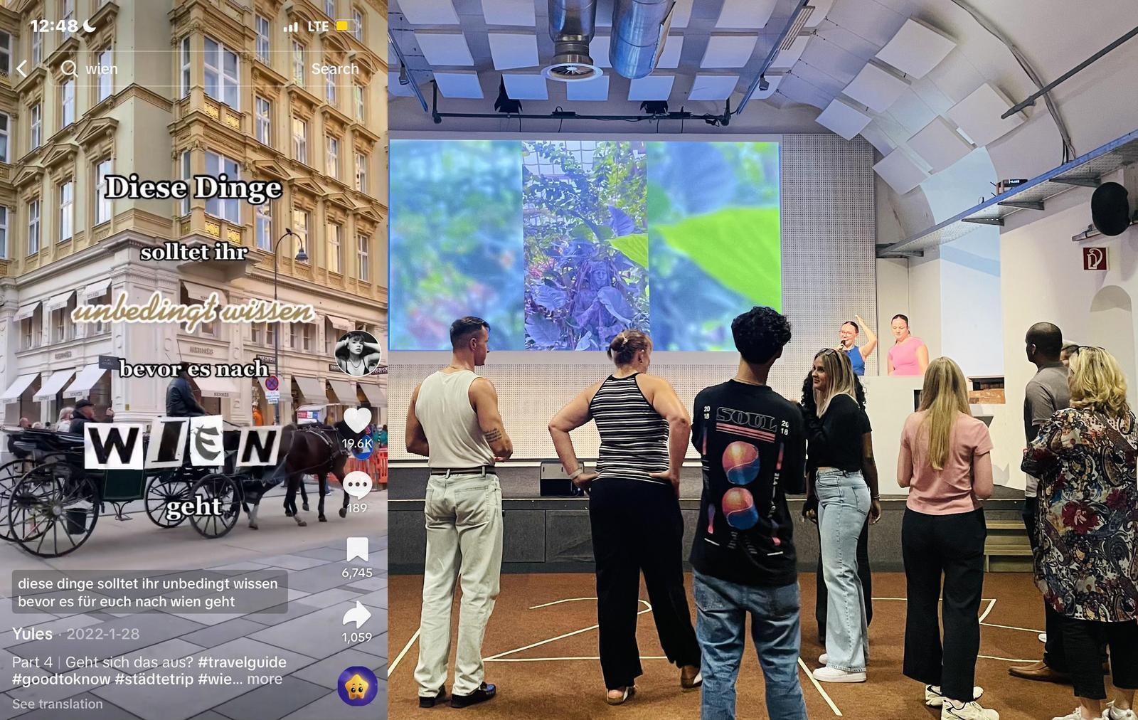 Danach erkundeten wir gemeinsam Wien und stellten uns dabei die Frage, ob das eigene und das touristische Bild von Wien deckungsgleich sind bzw. inwieweit sie sich unterscheiden. Dabei besuchten wir den ersten Bezirk sowie die neue WU und veranlassten die Schüler/innen, ihre Wohnumgebung mittels Handyvideos festzuhalten. In den abschließenden Projekttagen erarbeitete jede Gruppe ein Video, in dem sie mittels Schnitttechnik diese Eindrücke inszenierten. Zudem beschäftigten sie sich nochmals mit der Ausstellung und entwickelten u.a. ein Ratespiel zu den Inhalten. Die Ergebnisse wurden im Juni im Az W vor erweitertem Publikum präsentiert und sind weiterhin auf den Social-Media-Kanälen beider Institutionen zu sehen.
