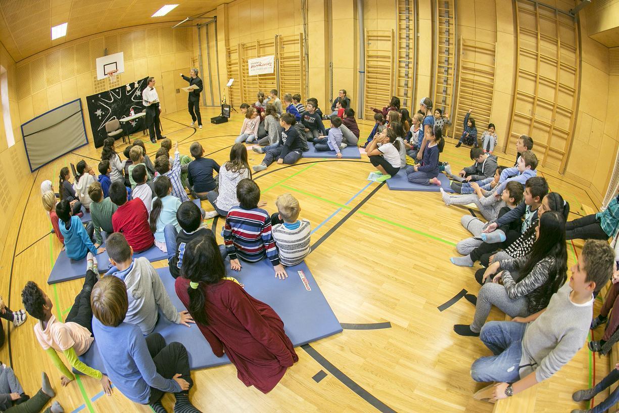 Alle Schülerinnen und Schüler der GTVS Olly-Schwarz (ca. 210) und ihre Lehrpersonen sahen in der Turnhalle die interaktive Lesetheater-Performance 'Alles OK, Rotkäppchen?!' von Theater Mopkaratz. Dabei bekamen die Kinder der am Projekt beteiligten Klassen (und die anderen Klassen auch) einen ersten Eindruck, wie einfach und lustvoll Theater sein kann – durch Lesetheater!