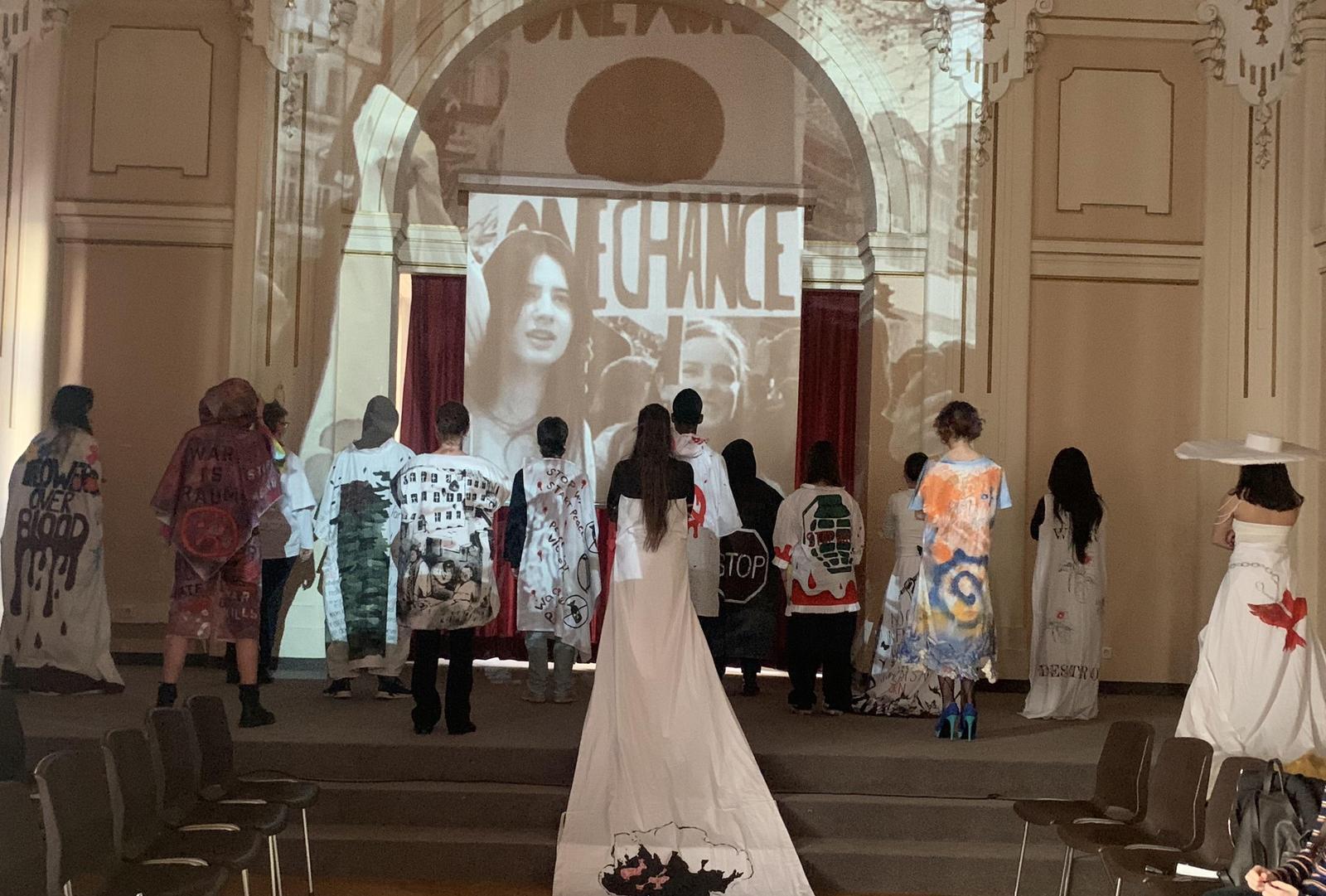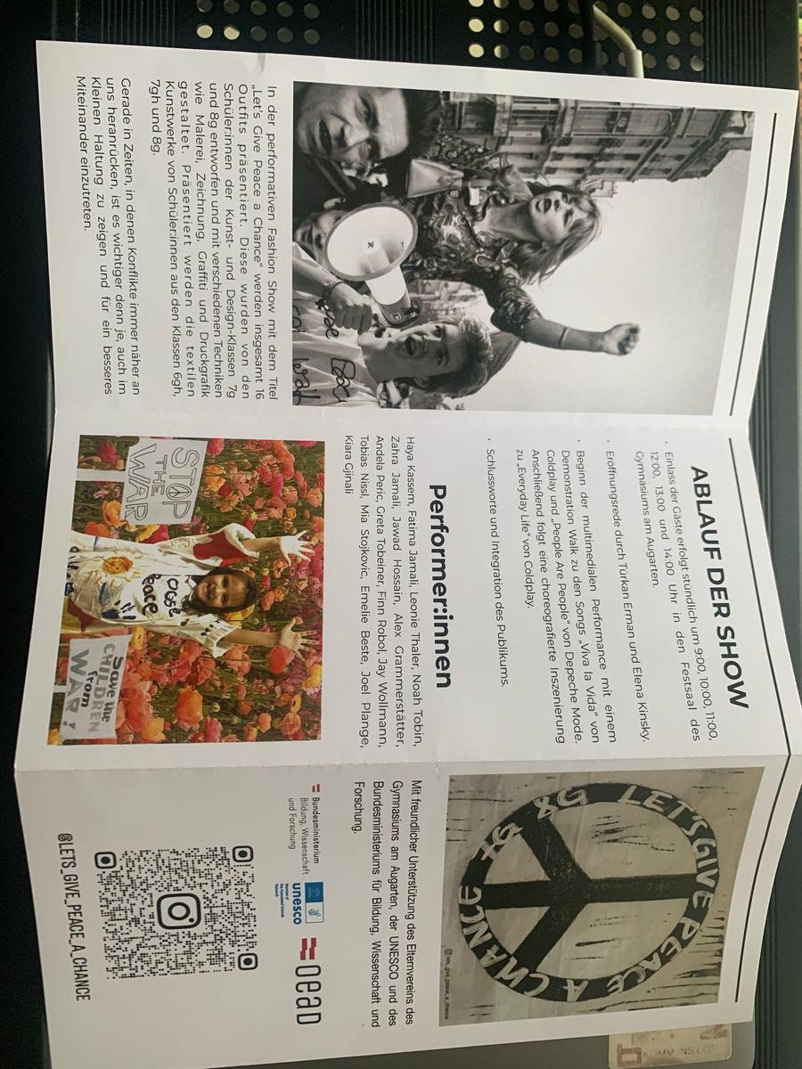 Die Kunst- und Designklassen 7g und 8g des Gymnasiums am Augarten entwickelten eine multimediale, performative Fashionshow unter dem Titel "Let's Give Peace a Chance". Nach Ausstellungsbesuchen und intensiver Auseinandersetzung mit dem Spannungsfeld zwischen Krieg und Frieden entstanden individuelle Outfits mit Friedensbotschaften vorne und kritischen Statements gegen Krieg auf der Rückseite. Die Gestaltung erfolgte in vielfältigen Techniken wie Malerei, Druckgrafik und Graffiti.