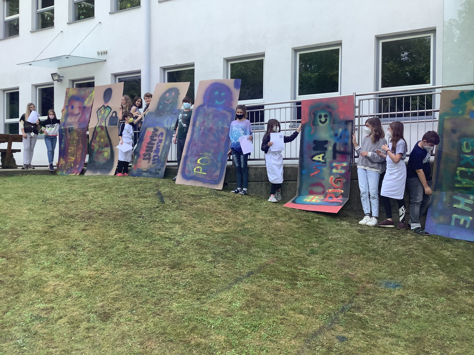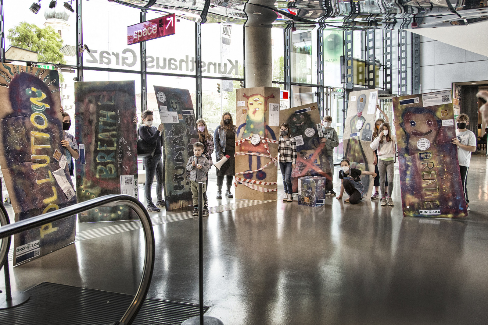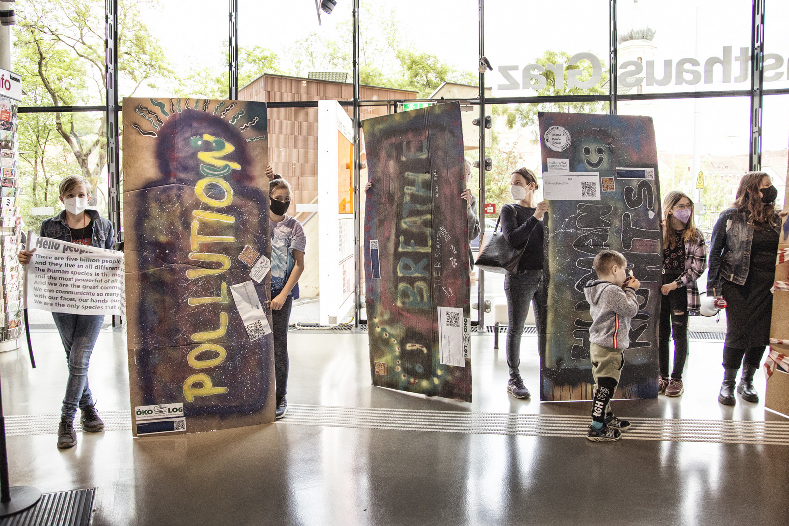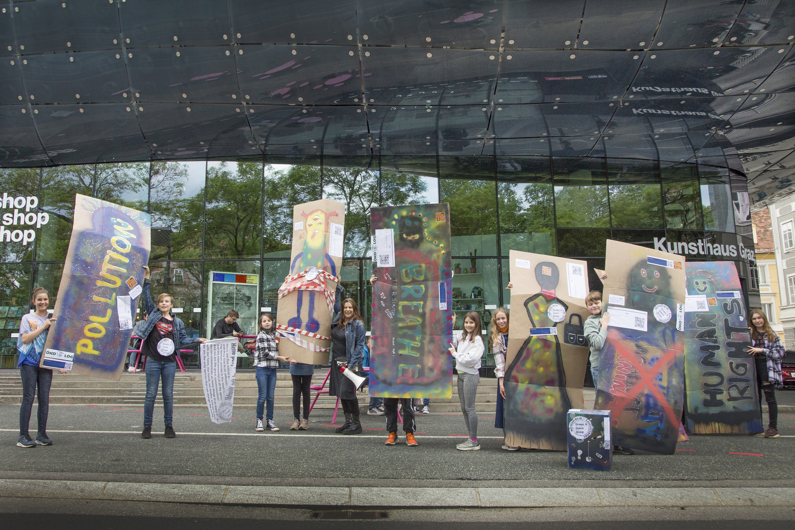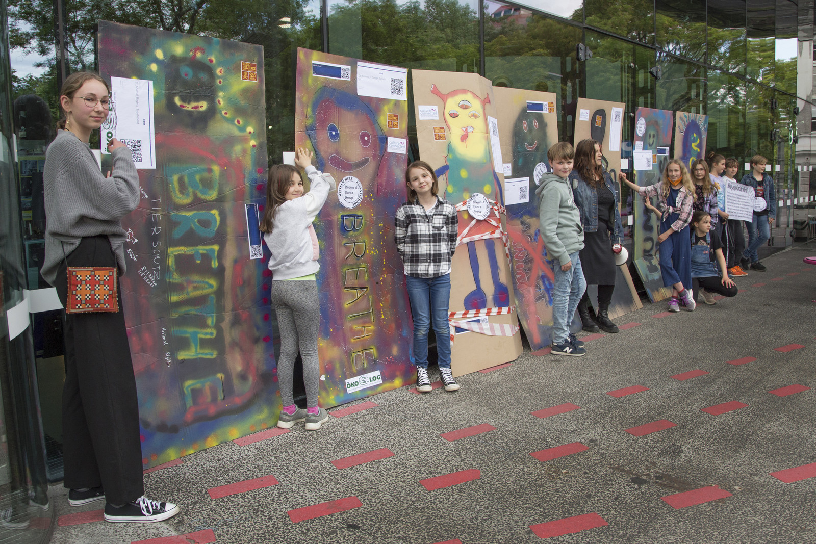 Nach einer selbstständigen Auseinandersetzung mit den Themen und der Gestaltung von Audio Files in Kooperation mit Radio Helsinki entstand das Drehbuch zur „TV Doku“ und den Audio Files. Im Schulwald wurden die Texte von Schüler/innen im Rahmen der Vernissage in Szene gesetzt. Im Anschluss, beim Durchwandern des Waldes und Betrachten der Kunstwerke - 11 übergroße Pappfiguren jede mit QR-Code und einer wichtigen Botschaft - sind die Stimmen (Podcast/Audio Files) der Schüler/innen über “Headphones“ zu hören. Sie können über die QR-Codes abgerufen und am Smartphone angehört werden.