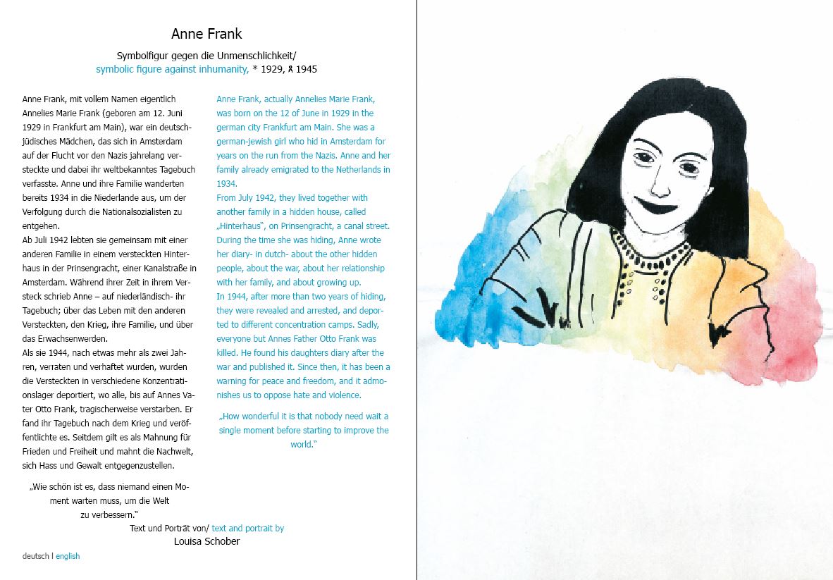 PEACE FIGHTER - ein Buch zum Thema Frieden - ist eines von mehreren Ergebnissen der Auseinandersetzung mit dem Thema Frieden. Es wurde über einen längeren Zeitraum mit Schüler/innen verschiedener Klassen gestaltet. Der Fokus lag dabei auf einzelnen Persönlichkeiten. Die Jugendlichen konzentrierten sich auf eine „Friedensperson“ ihrer Wahl, schrieben Kurzbiografien in zwei Sprachen und wählten ein künstlerisches Medium oder entschieden sich transmedial für die Umsetzung eines Porträts. Wesentlich für das Buch war die Vielfalt in Sprache und Bild sowie die freie Wahl der „Friedensperson“. Positiv wirkt die farbliche Typografie von Felix Herma auf dem Cover des Buches, für dessen Grafik eine von vielen großartigen Illustrationen ausgewählt wurde.