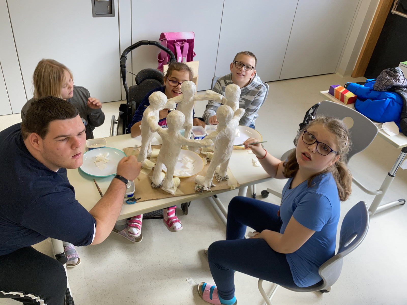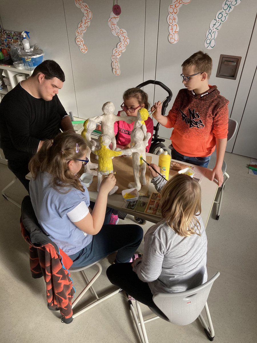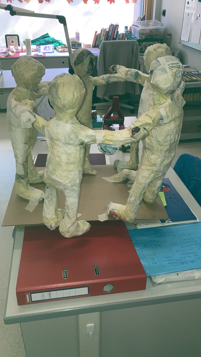 In der Klassengemeinschaft konnten positive Gefühlsempfindungen erlebt, verbalisiert und in ihrer Notwendigkeit bewusst gemacht werden. Dabei stellte sich heraus, dass die Gruppentänze den Kindern die größte Freude bereiteten. Aus dieser Empfindung entwickelte sich die Idee die beliebten Kreistänze – sinnbildlich für das eigene Erleben – in Form von BUDAWI-Figuren als künstlerisches Werk umzusetzen. Während des handwerklichen Schaffens ergaben sich vielfältige Chancen der Kommunikation und der Neubegegnung zwischen den Kindern. So wurden Streitigkeiten thematisiert, Lösungswege entwickelt und auch Belastungen durch unreflektierten Medienkonsum im Lebensalltag der Kinder angesprochen. Alle Mitwirkenden war sehr präsent im Tun, spürten sich in ihrer eigenen Präsenz und auch die Nähe zueinander. Das gemeinsame kreative Arbeiten bot einen zeitlichen und emotionalen Raum, um auf unterschiedliche Gefühle einzugehen und gelassener in den Alltag zurückzukehren. Dieses Kunstprojekt eröffnete die Chance sich mit allen Sinnen und wesentlichen Werten auseinanderzusetzen, sowie dabei eine einzigartige Skulptur zu schaffen.