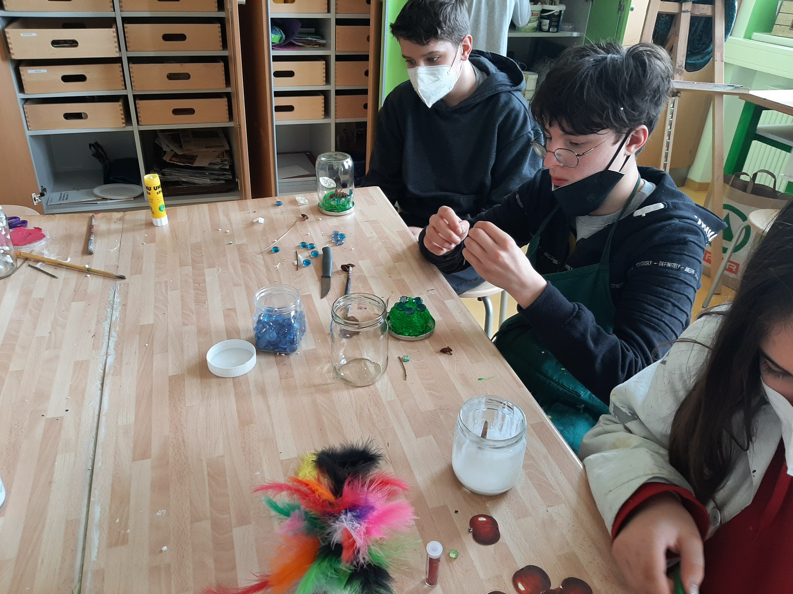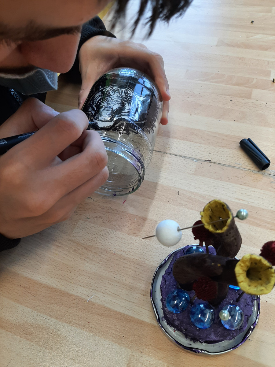 Der Unterricht erfolgte zum größten Teil projektbezogen. Das Kunstprojekt mit dem Arbeitstitel „Kleine Welten“ stand dabei im Zusammenhang mit dem Politik- und Geographieunterricht. Die Schüler/innen behandelten in Geographie ‚ihren‘ Kontinent Europa sowie die EU. Natürlich kam der Krieg in der Ukraine und andere Bedrohungen wie der Klimawandel und Corona-Pandemie zur Sprache.