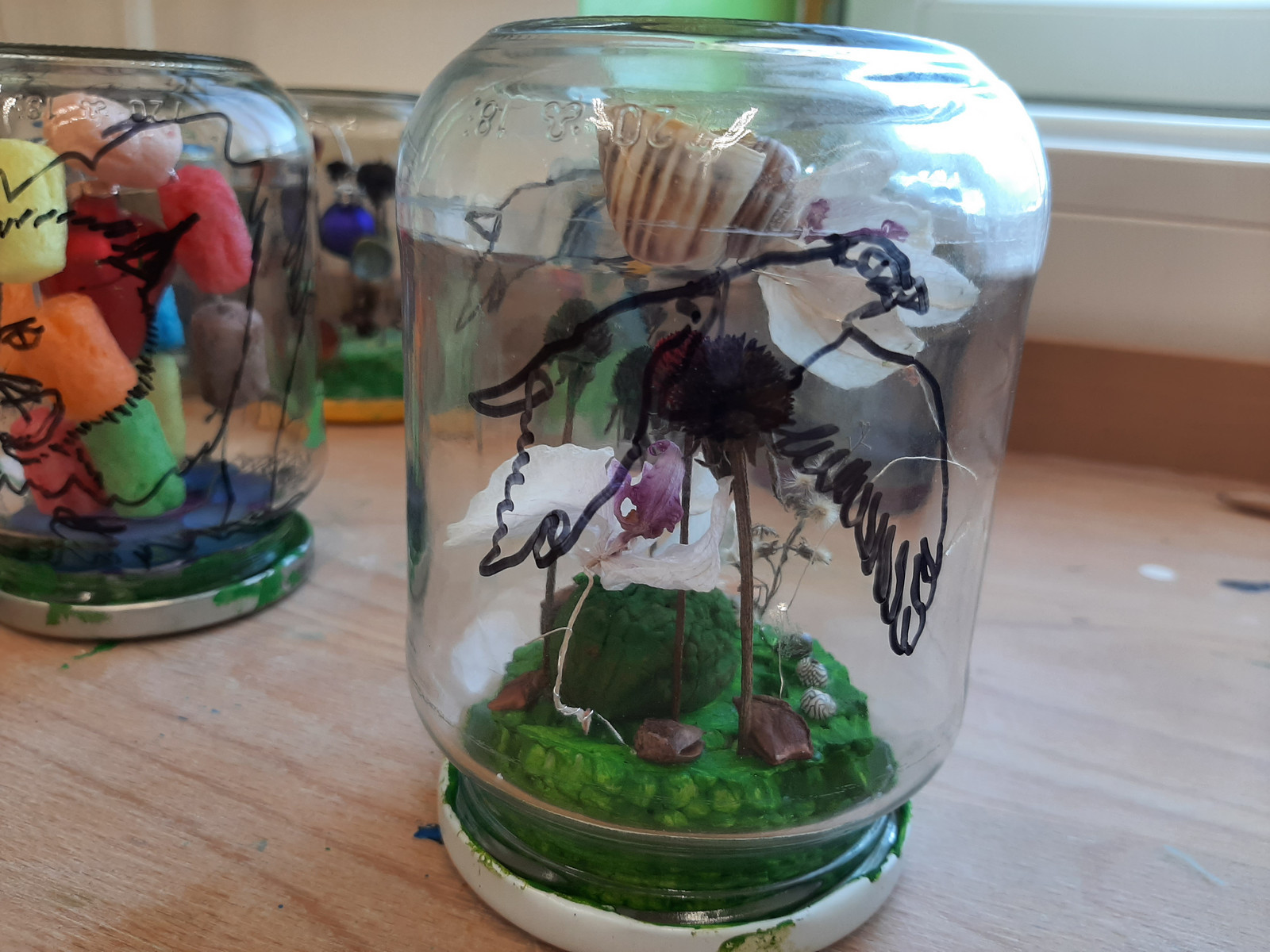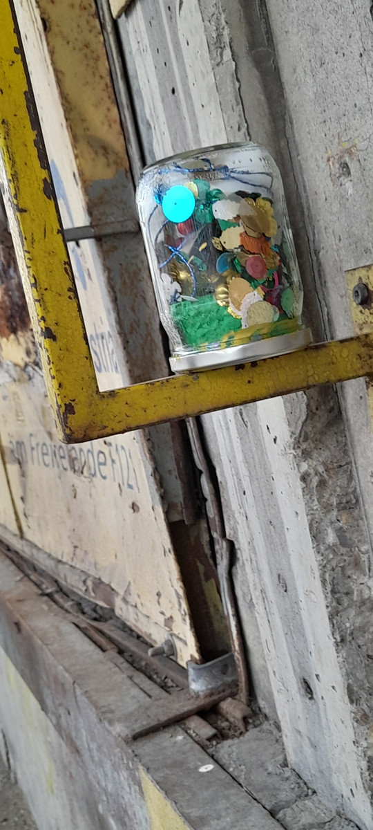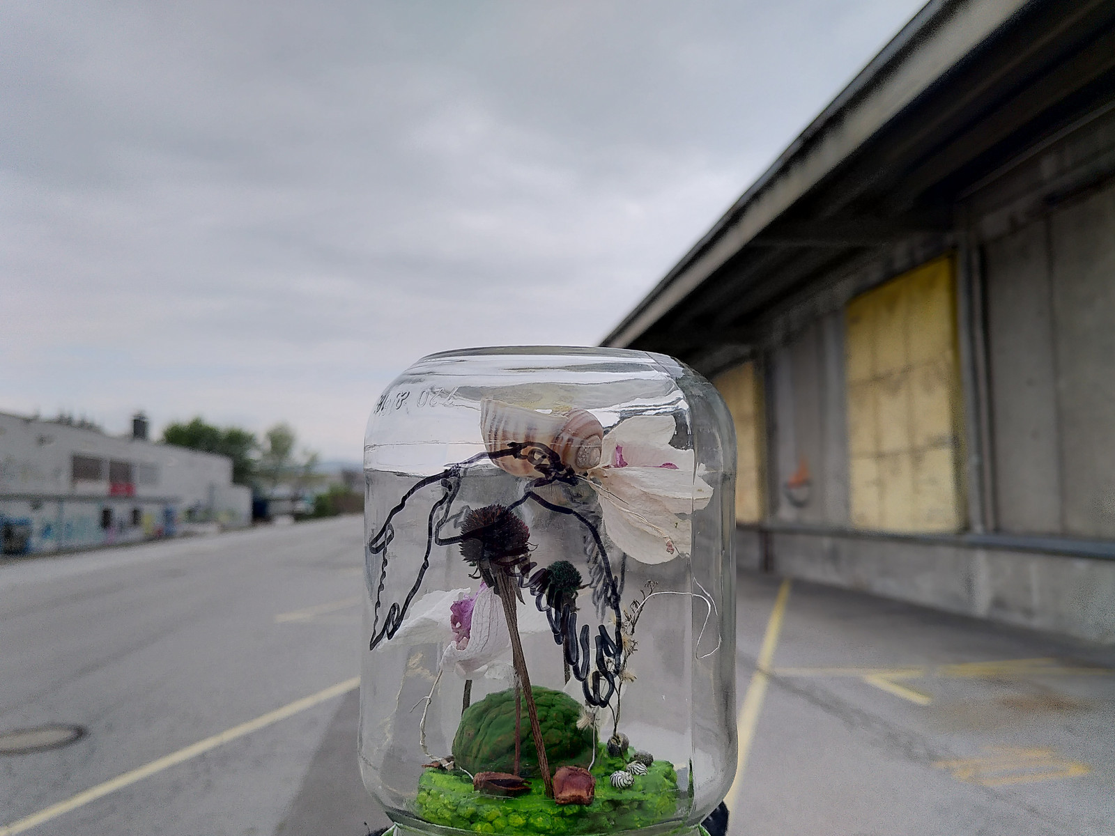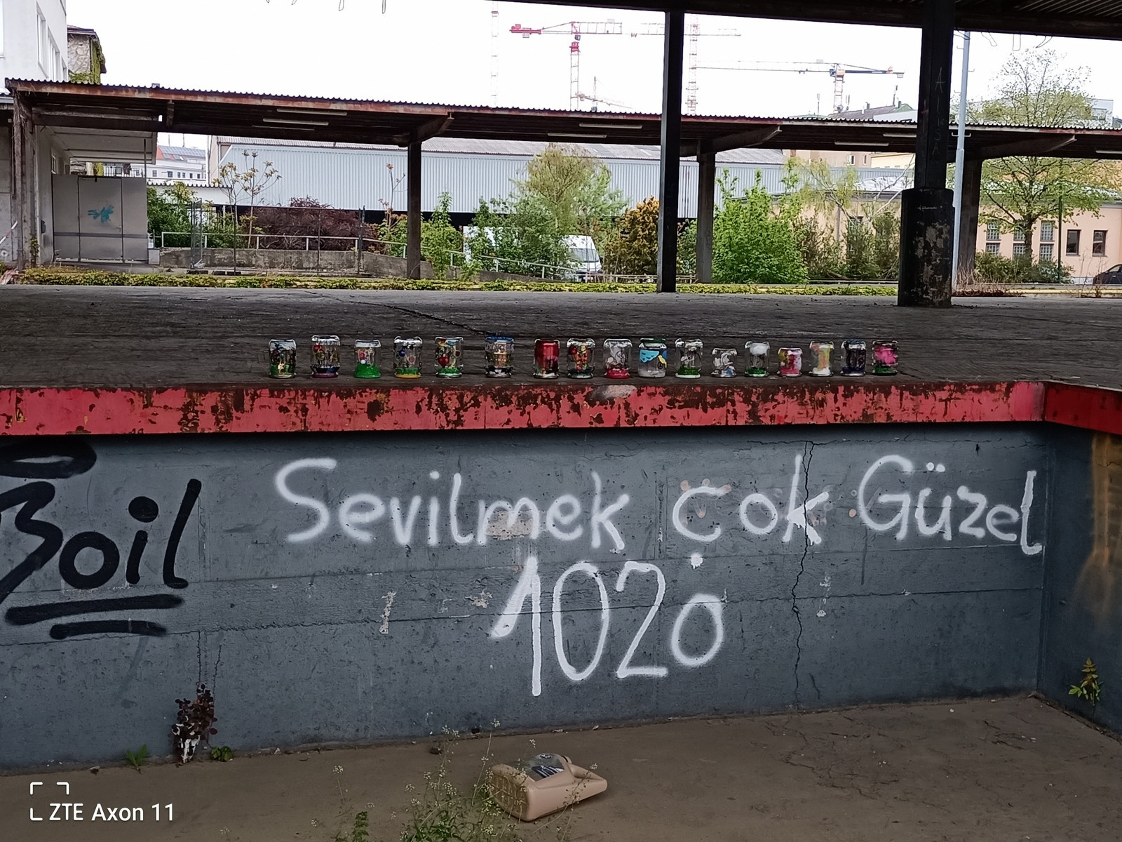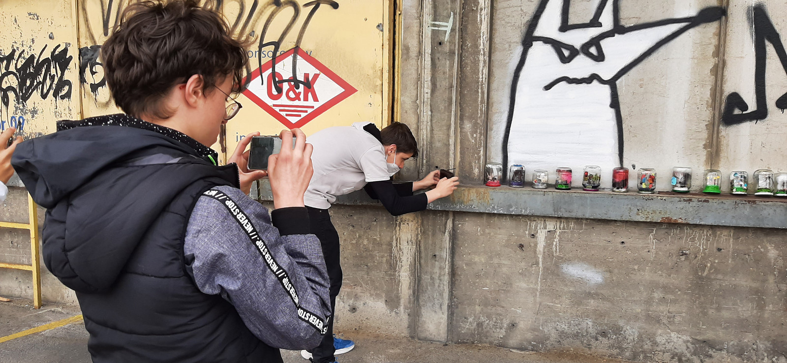 Die Schüler/innen überlegten sich was sie als WIR künstlerisch gegen all das Hässliche tun können, das gerade in Europa und auf der ganzen Welt geschieht. „Eigentlich nichts, oder nur was Kleines“, schein die Antwort zu sein. Dies war das Stichwort für den Vorschlag der Lehrerin in Gurkerlgläsern eigene, kleine und bunte ‚Welten‘ zu installieren, sie dem großen Hässlichen entgegenzusetzen und dies in Videos und mit Fotos festzuhalten. Die Fotos sollten an einem unschönen Ort gemacht werden, damit der Kontrast möglichst groß ist. Die Jugendlichen schlugen hierfür eine Industriebrache in der Nähe vor.