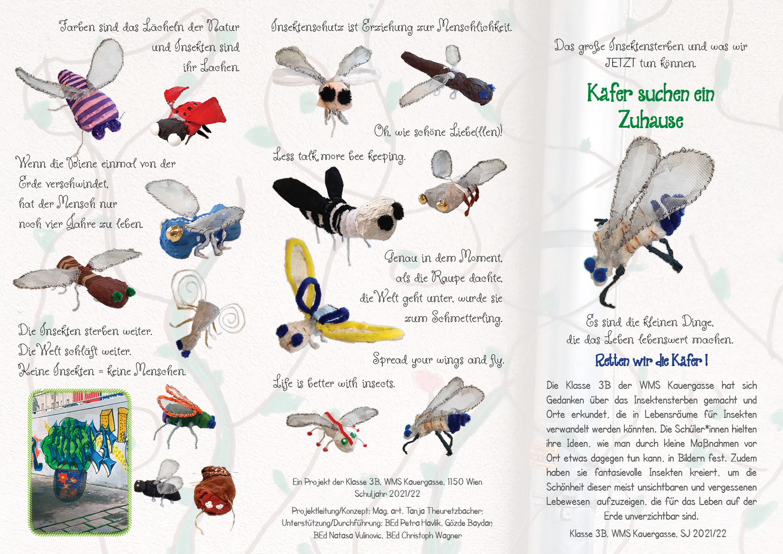 Im Projekt sollte daher Aufmerksamkeit auf die Bedeutung der Insekten für die menschliche Umwelt gelenkt und erkunden werden, welche Mikrobeiträge Schüler/innen und Bewohner/innen örtlichen Stadtgebiets leisten können, um das Insektensterben aufzuhalten. Der Arbeitsprozess begann mit dem Erlernen der Anatomie von Insekten und ihrer Rolle im Ökosystem, das zugleich den Ausgangspunkt für die Käfer-Kunstobjekte bildete, welche die Schülerinnen und Schüler über mehrere Monate hinweg gestalteten.