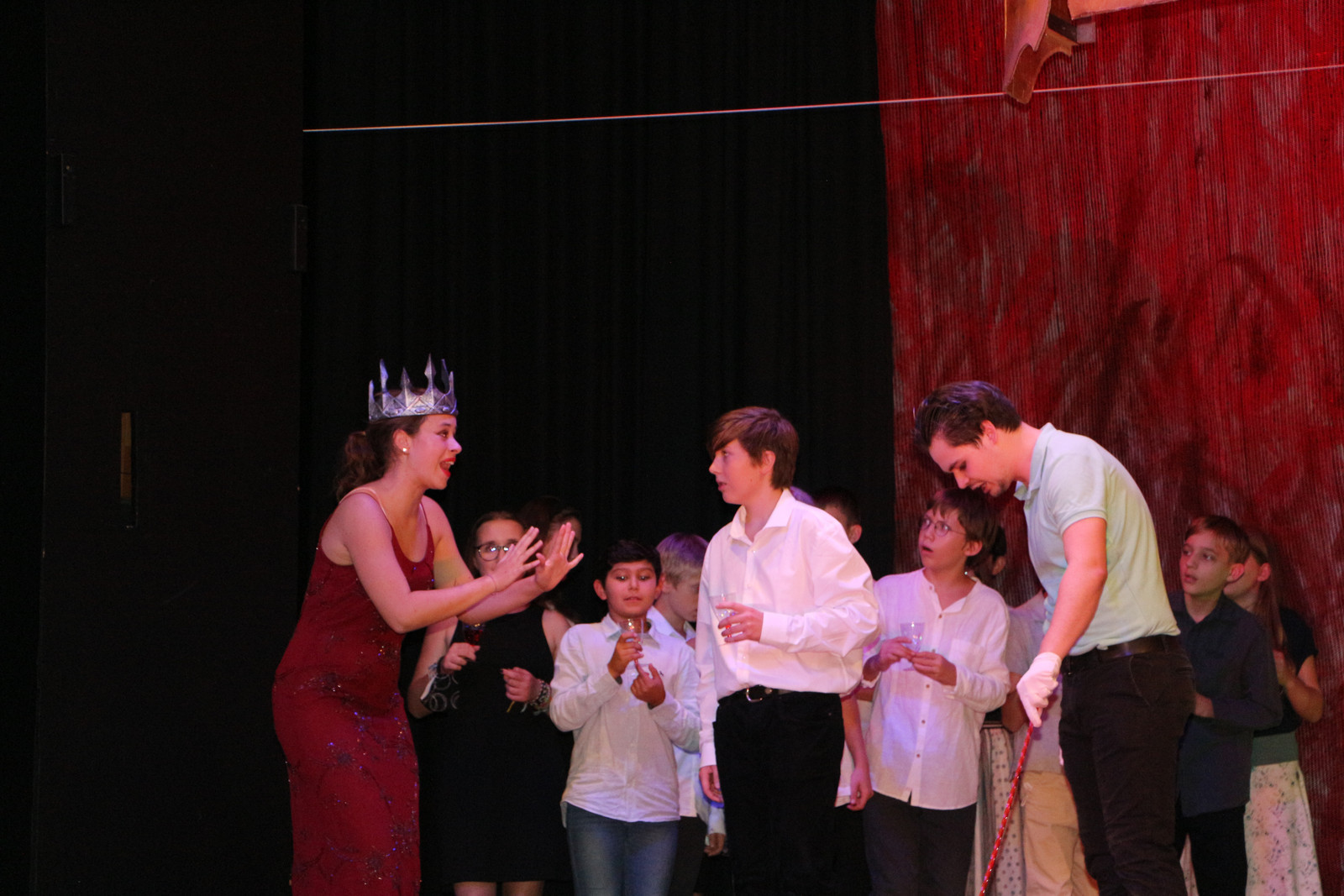 Zugleich war aber auch ein Ziel des Projekts, aufzuzeigen, dass die weit ins Publikum hineinragte Shakespearebühne des 17. Jahrhunderts Parallelen zu Brechts epischem Theater aufweist. Seine Forderung, die unsichtbare 4. Wand zu durchbrechen, realisierten die Schülerinnen und Schüler mithilfe des Einreißens einer riesigen Folie in der ersten Szene. Der Bänkelsänger, dargestellt von einem Schüler beispielsweise, kommentierte und verballhornte das Geschehen im Brecht’schen Sinne mithilfe von Moritaten aus der Dreigroschenoper.