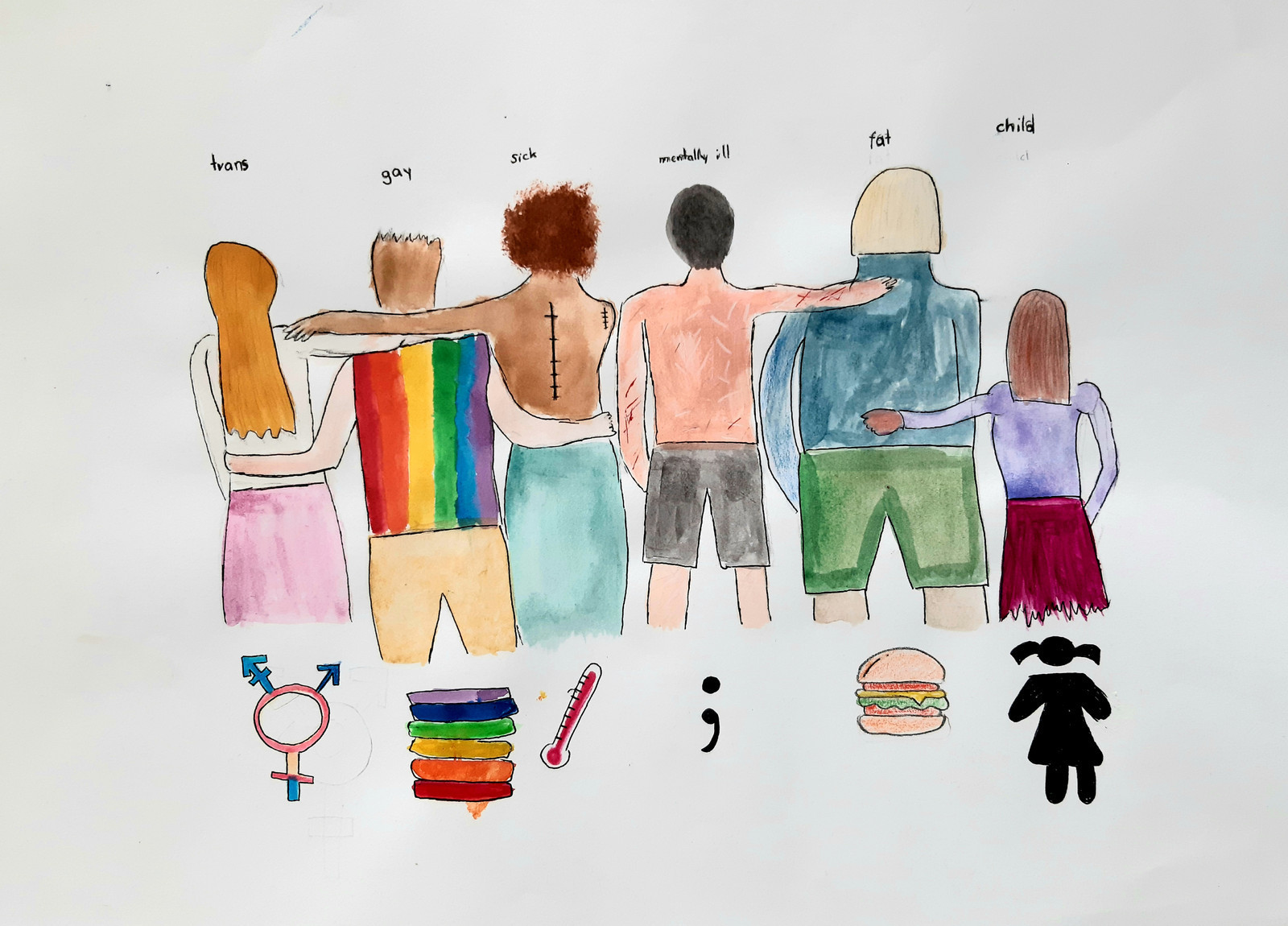 Schüler und Schülerinnen der 5l Klasse gestalteten Bilder nach freier Wahl der Technik zu einem von drei Themen: Inklusion und Diversität, Digitaler Wandel sowie Nachhaltigkeit. Am Anfang diskutierten sie über Inhalte wie Mobbing, Exklusion, Inklusion, Diversität, Ausgrenzung, Bodyshaming, Rassismus, Cybermobbing, Medien, über soziale Netzwerke und ihr Einfluss auf Psyche der jungen Menschen, und über Minderheiten mit verschiedenen sexuellen Orientierungen sowie deren Rechte.