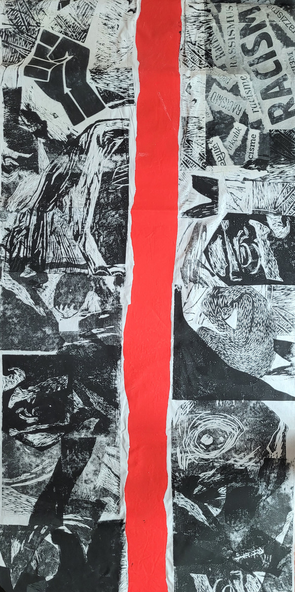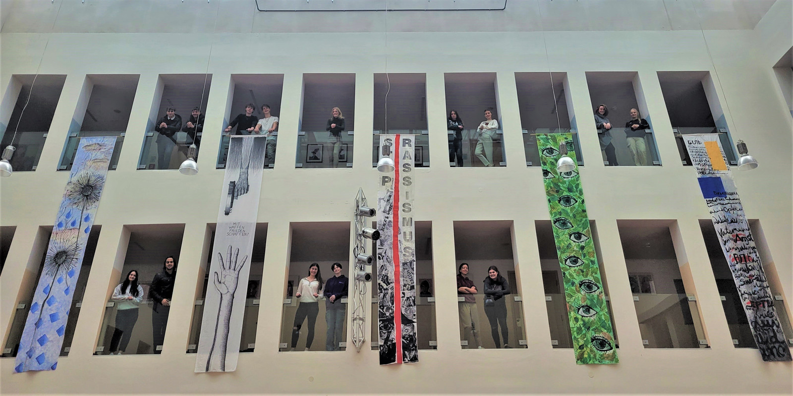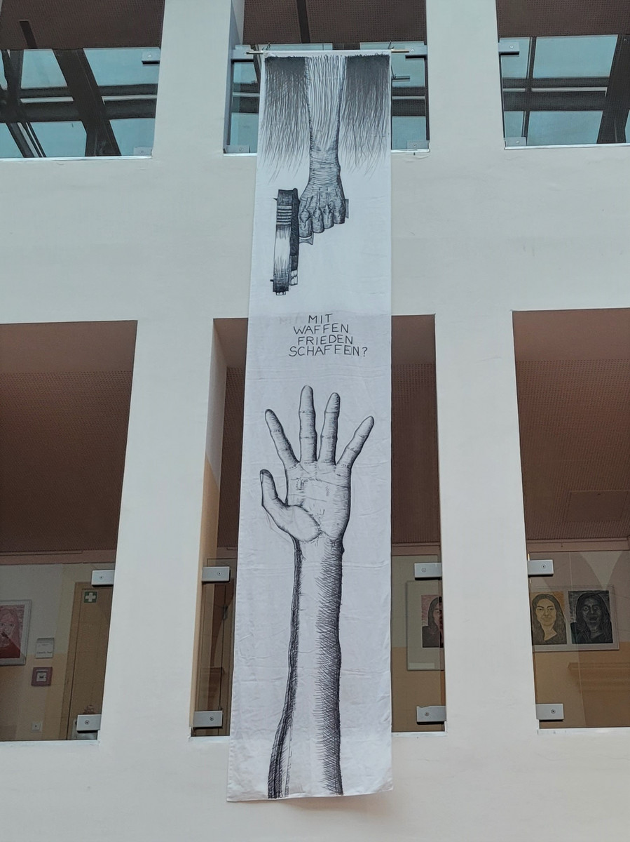Die Schülerinnen und Schüler der 8. Klasse entschieden sich für fünf aktuelle Themen (Krieg in der Ukraine, Waffenlobby, Rassismus, Naturschutz und Klimawandel) und bearbeiteten diese in Form einer Fahneninstallation.
