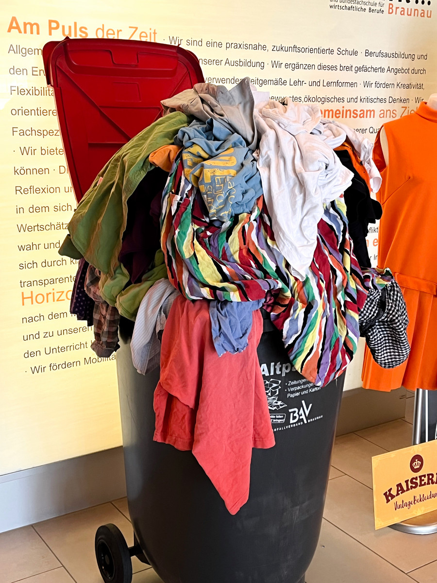 In Kleingruppen wurden neun verschiedene Teilprojekte erarbeitet, die bei einer Ausstellung mit Mitmachstationen allen Schülerinnen und Schüler dem HLW-Braunau vorgestellt wurden. Themen waren Greenwashing, Fast-Fashion Unternehmen, konventionelle und umweltfreundliche Textilien, Herstellungswege, Nachhaltigkeitssiegel und viel mehr.
