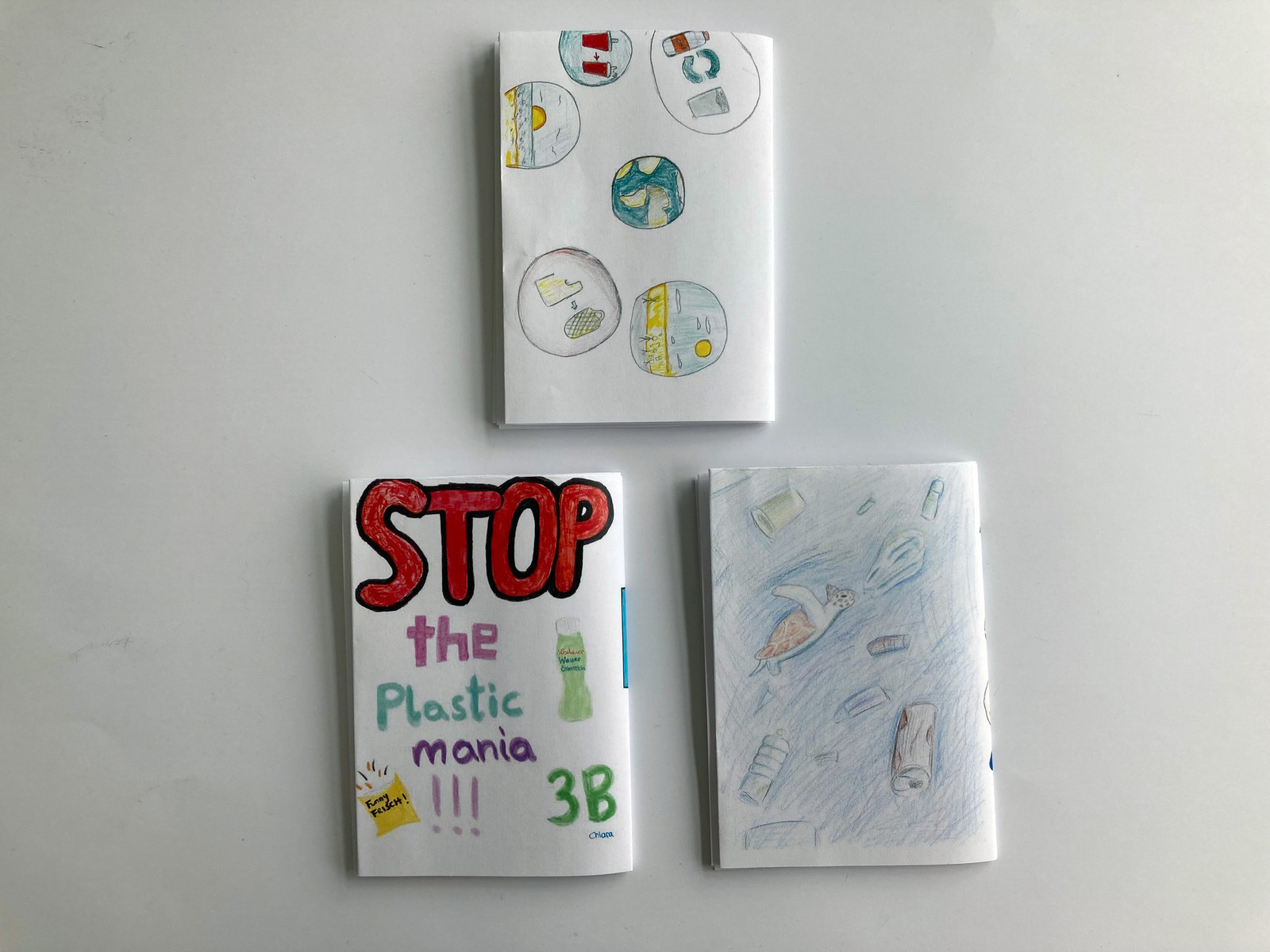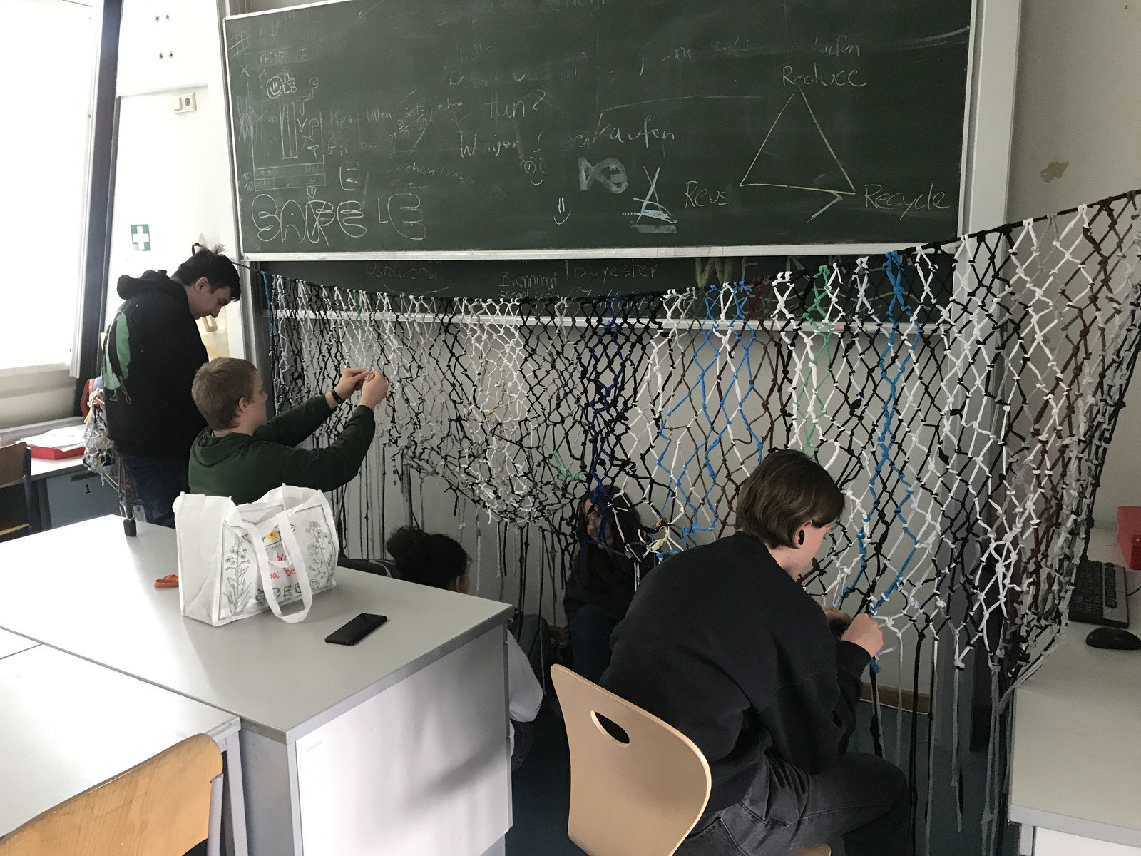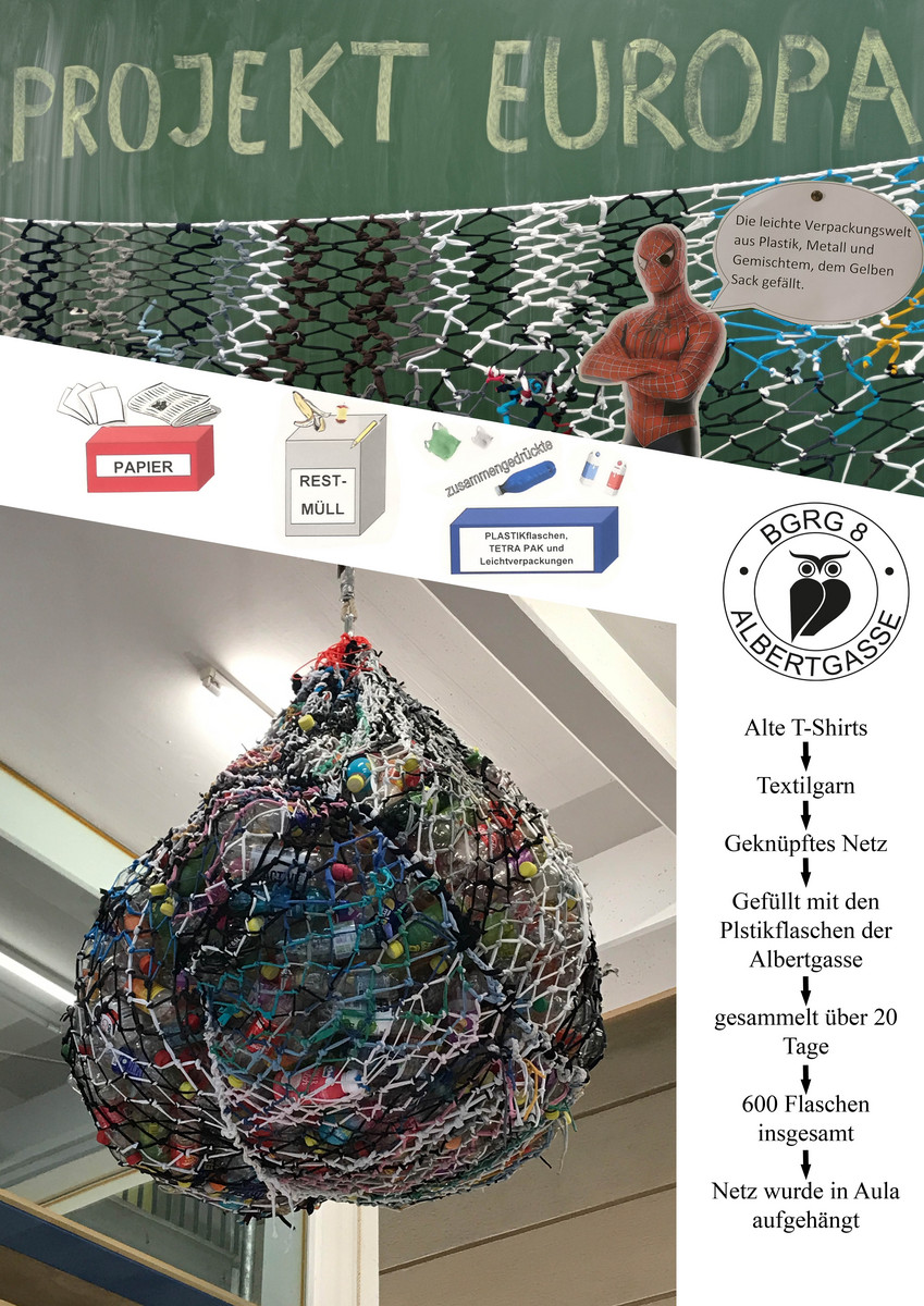 Ausgangspunkt des Projekts war die Bestandsaufnahme des Verbrauchs an PET-Flaschen an der Schule über einen Zeitraum von 4 Wochen. Die leeren Flaschen wurden gesammelt und in einem von den Schülerinnen und Schülern in gemeinsamer Arbeit geknüpften Netz aus alten T-Shirts in der Aula der Schule von der Decke hängend präsentiert. Auch mithilfe anderen Darstellungsmedien machten die Jugendlichen auf das mit dem Thema "Plastikmüll" aufmerksam: Sie kreierten Zines, Plakate, Präsentationen oder Sticker, die als Informationsquelle dienen aber auch zur Reduktion des Plastikverbrauches aufrufen sollen.