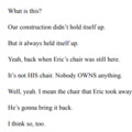 Das Theaterstück "Some construct genders, some construct chairs" beschäftigt sich mit den Themen Gender, Identität und Ressourcen. Es handelt sich um eine Stückentwicklung, die gemeinsam mit den Schülerinnen und Schülern der Drama Group an der Zaunergasse Salzburg entwickelt wurde. In einem ersten Schritt wurden die Jugendlichen der English Drama Group über Genderfragen, Geschlechter und identitätsstiftende Merkmale gesprochen. Ausgehend von diesen Gesprächen und Diskussionen wurden einzelne Szenen geschrieben.