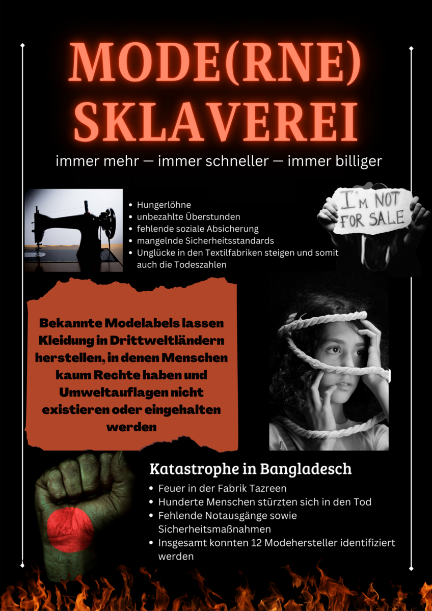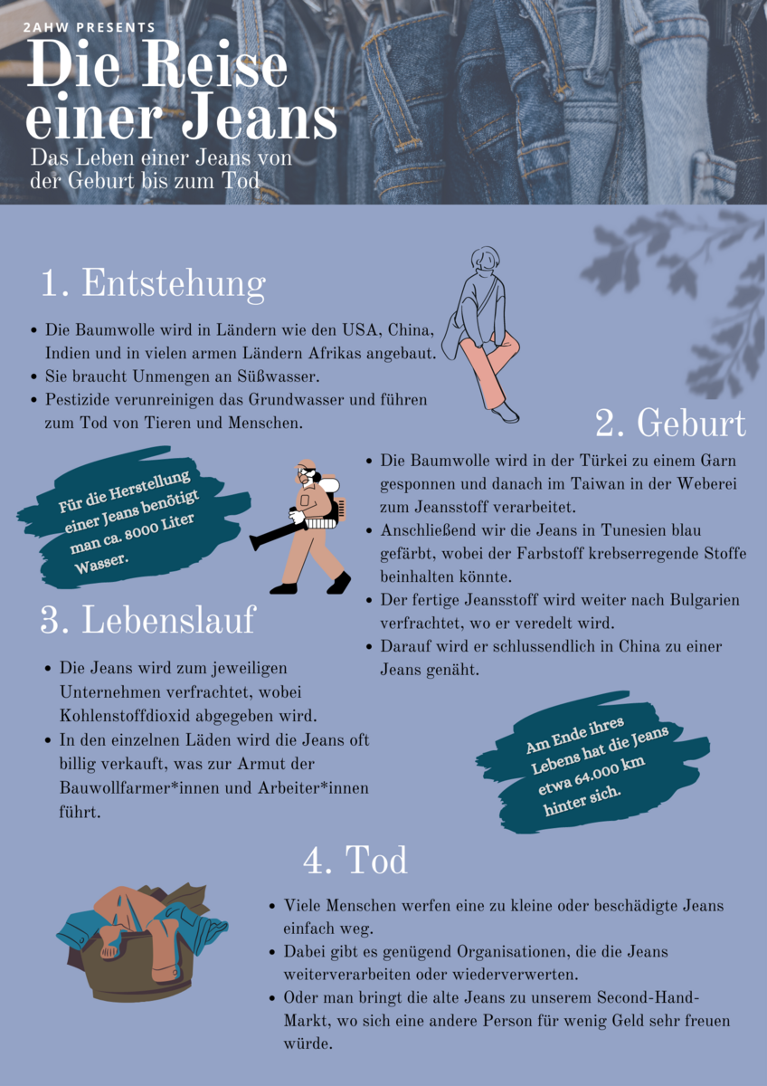 An der HLW St. Veit an der Glan wurde einen Secondhand-Markt für Mode in der Schule organisiert. Dafür setzten sich die Schülerinnen und Schüler der 2AHW zuerst mit den negativen Folgen von Fast Fashion für Mensch und Umwelt auseinander. Zu den verschiedenen Problemen wurden dann Plakate gestaltet, um die Schulgemeinschaft für das Thema zu sensibilisieren.
