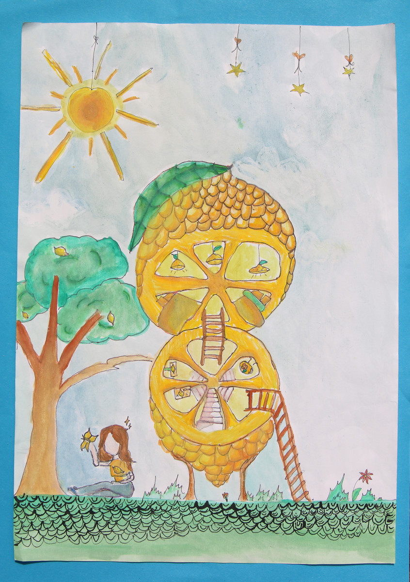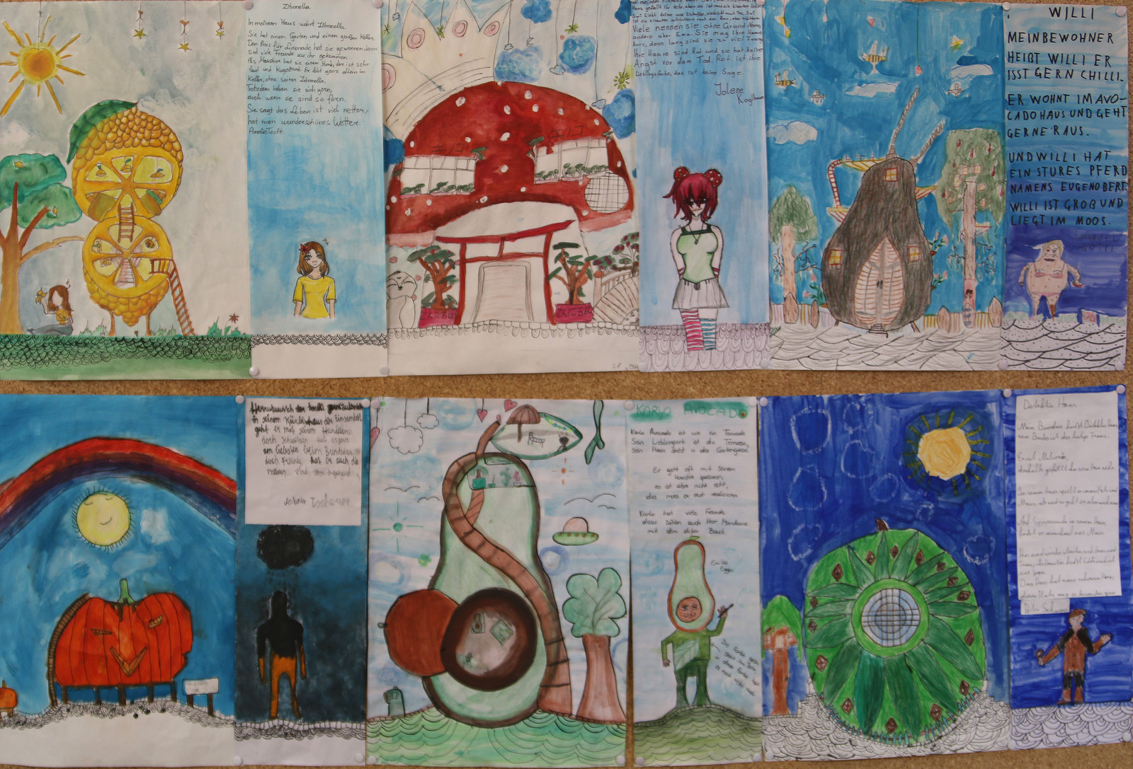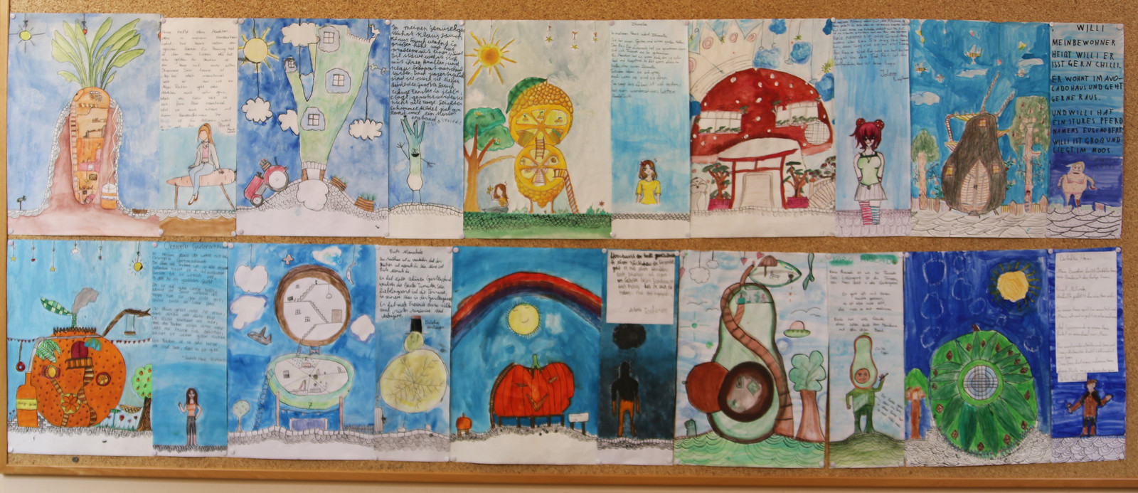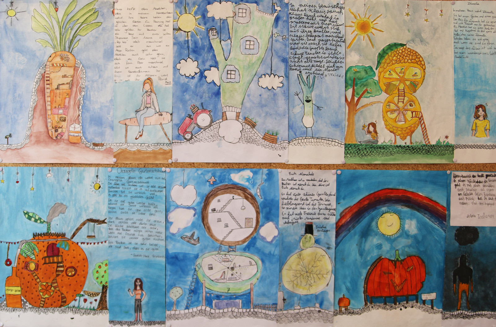 Die Schülerinnen und Schüler der 2A des Gymnasiums Fürstenfeld gestalteten fächerübergreifend das bunte Kinderbuch "DIE FÜRSTENFELDER GARTENGASSE": Bunte Obst- & Gemüsehäuser mit lustigen Bewohnerinnen und Bewohner sind über eine Straße miteinander verbunden. Was ist nachhaltiger als ein Garten?