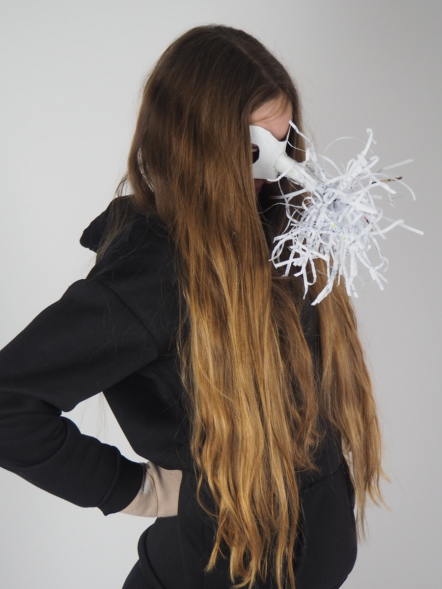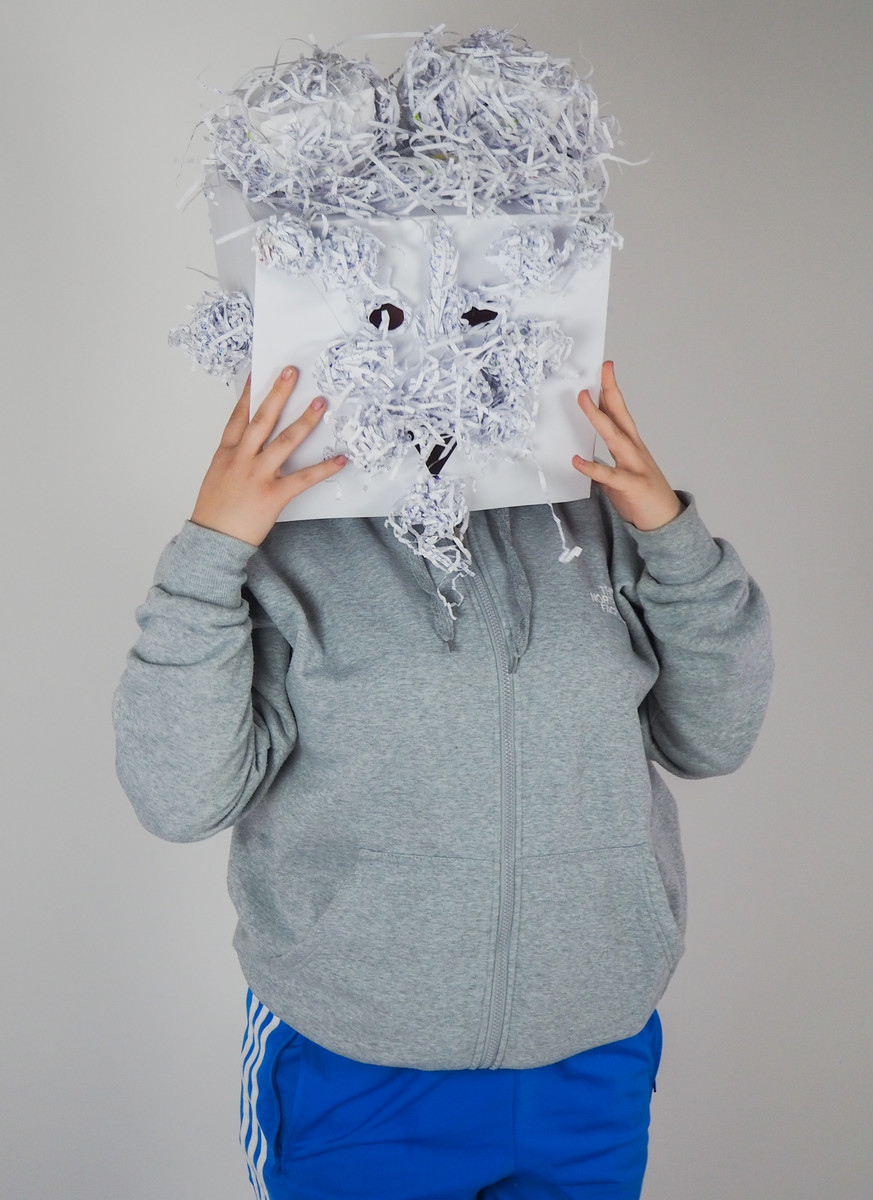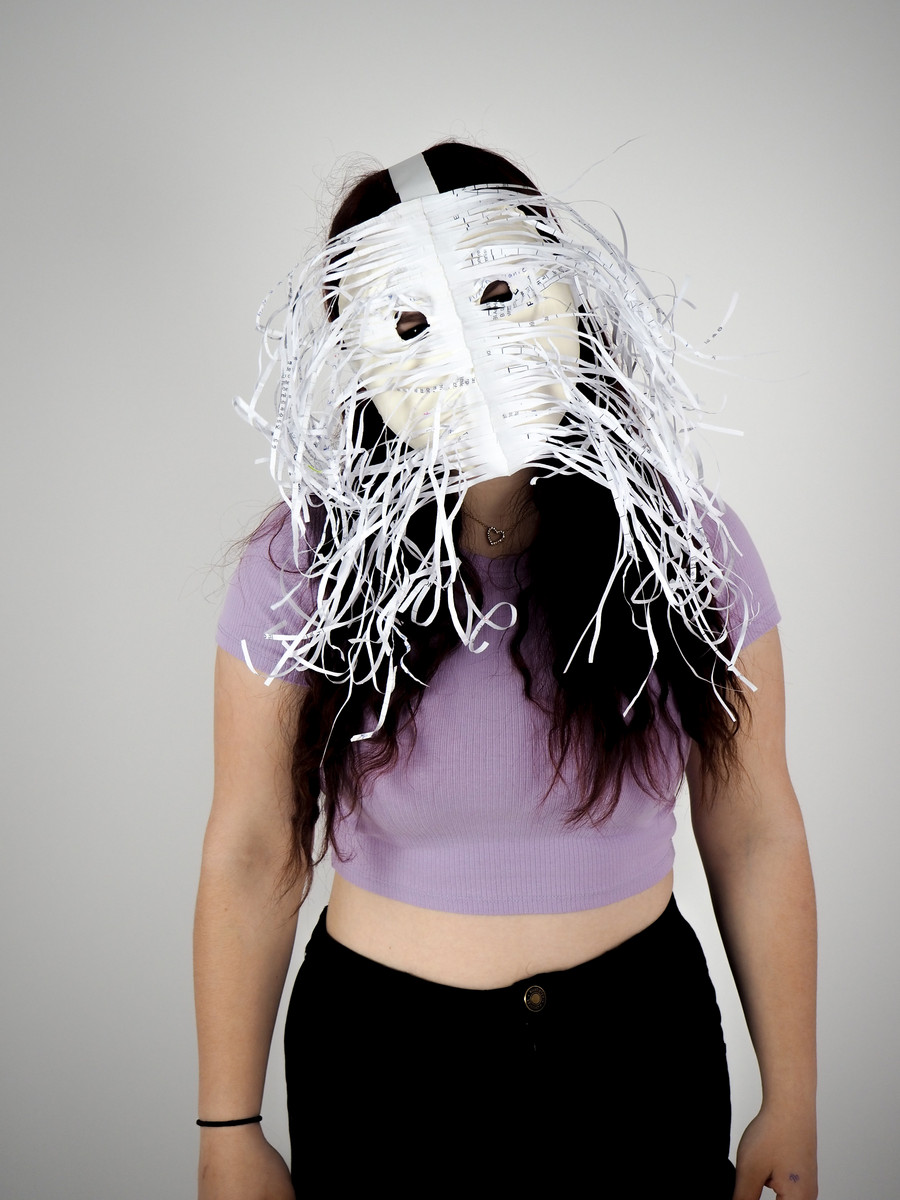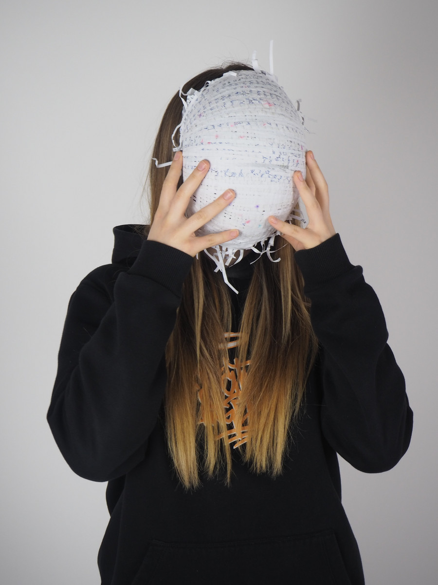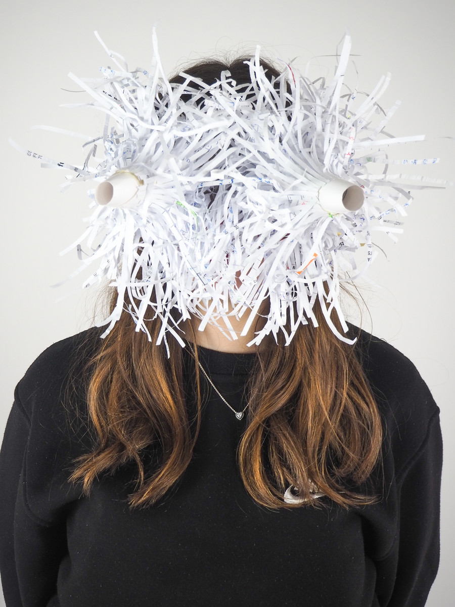 Aus diesen Papierstreifen gestalteten die Schüler/innen Masken, welche die Ambivalenz zwischen Schutz und Einschränkung, Ritual und Vermummung verkörpern. Nach theoretischem Input zu den Funktionen von Masken, Beschäftigten sich die Schüler/innen mit den als Material gewählten "Schnipseln" aus dem Aktenvernichter. Die Ambivalenzen, die dieses bei ihnen auslöste, und der zwiespältigen Funktion von Masken gaben sie dann beim Gestalten ihrer Arbeiten Ausdruck.