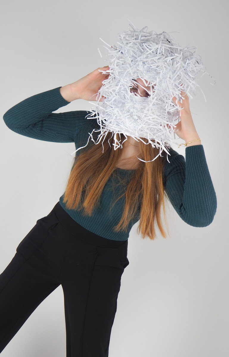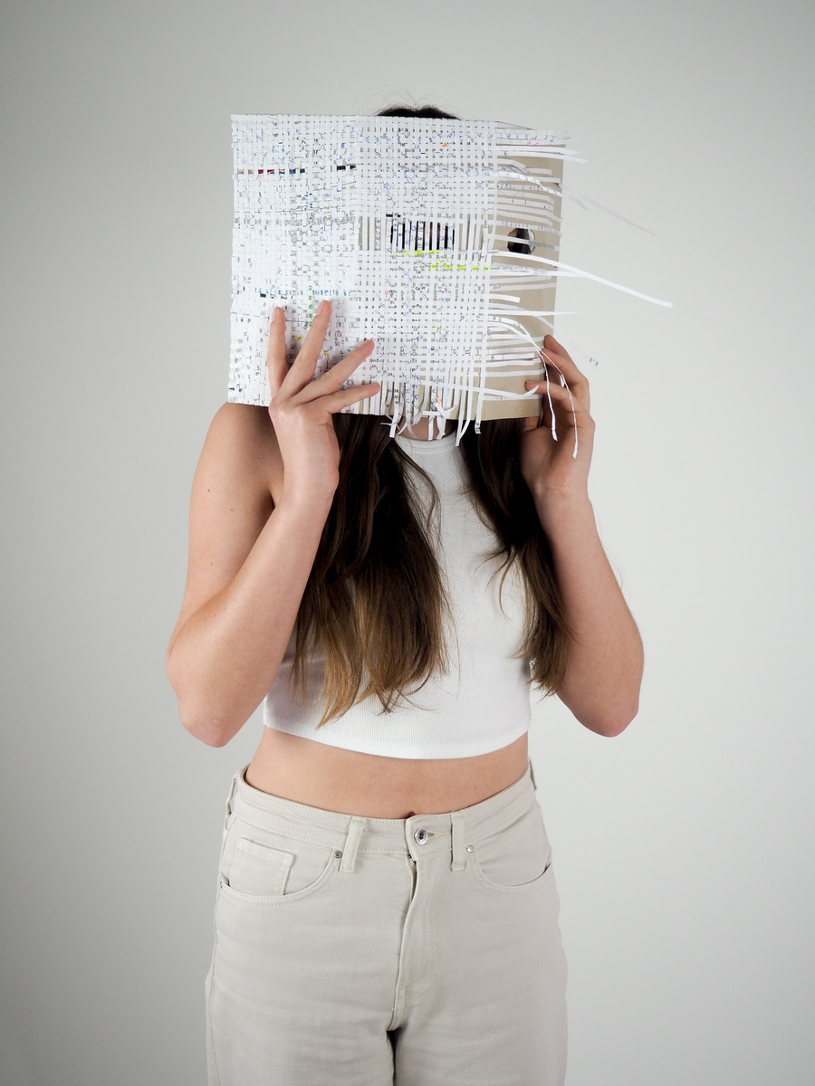Eine bewährte Methode in künstlerisch-angewandten Gestaltungsprozessen ist es, mit einem Material zu beginnen und sich von ihm leiten zu lassen. Diesen Zugang folgte auch das Projekt der HLW Braunau am Inn das die in großen Mengen verfügbaren Papierstreifen aus dem Aktenvernichter der Schule in den Fokus nahm. Sie sind als Material sind nicht nur ästhetisch, sondern aus symbolisch interessant: Weiße Streifen in deren subtilen Farb- und Schriftanteilen alten Schularbeiten und Maturaaufgaben aufgehen und die zugleich komplexe Verwaltungsstrukturen und Behördendschungel versinnbildlichen.