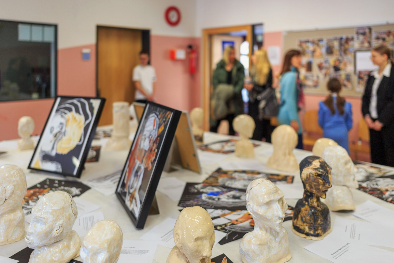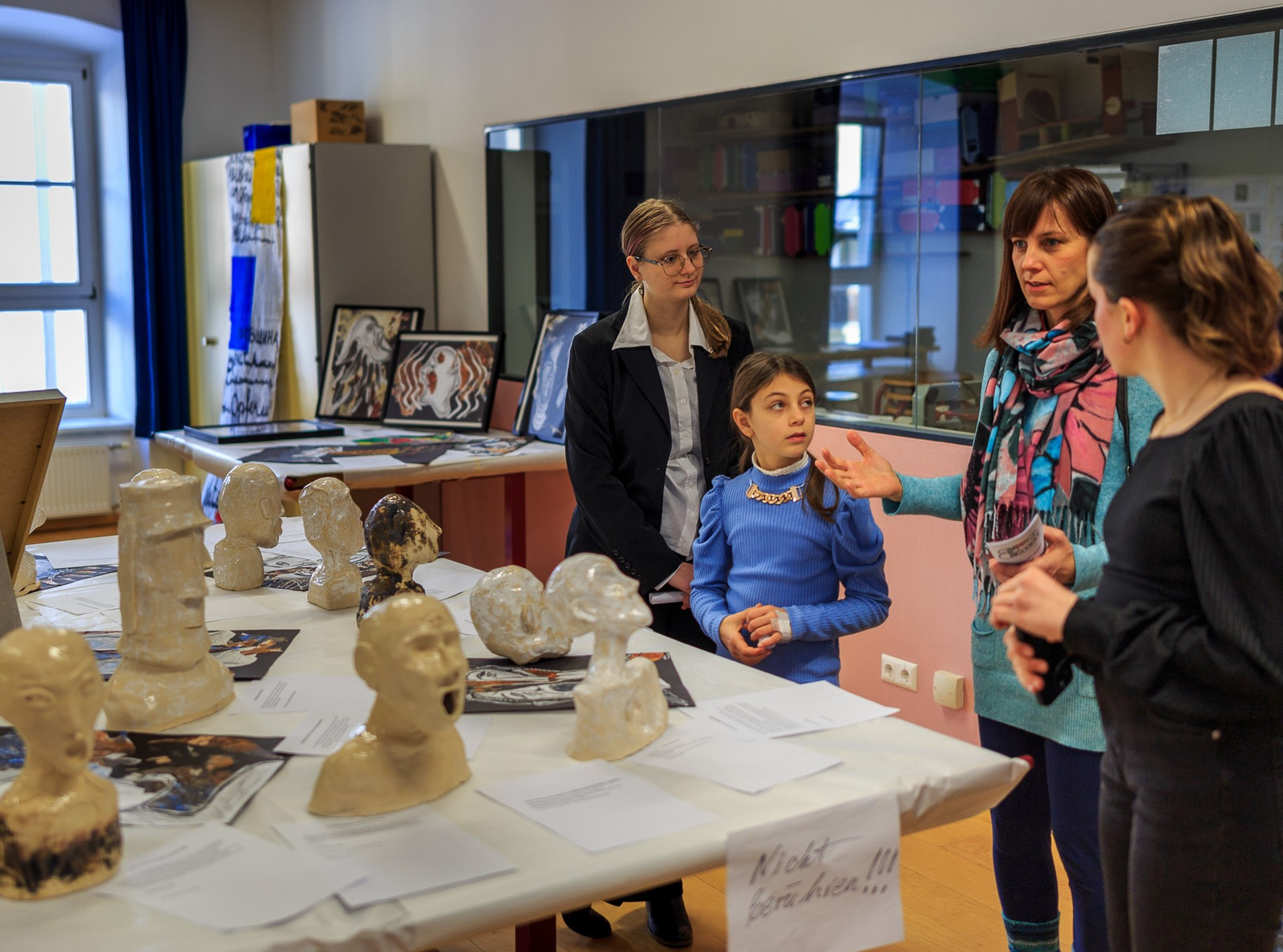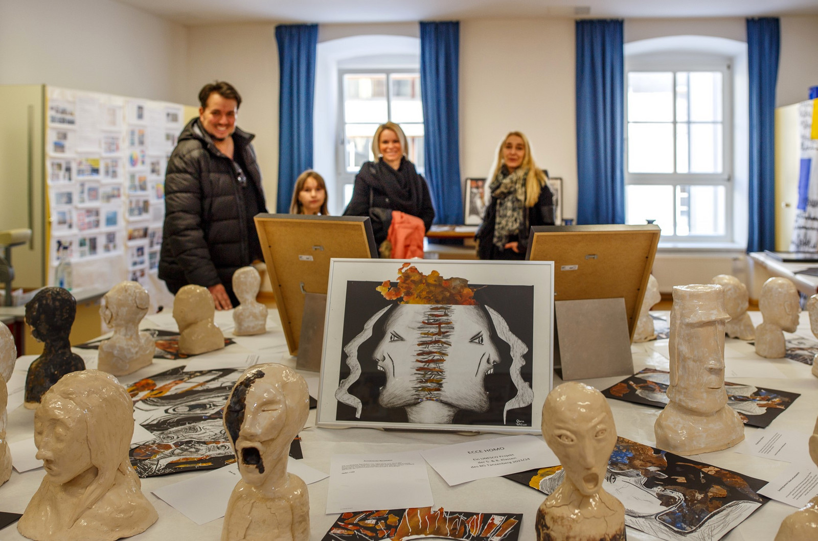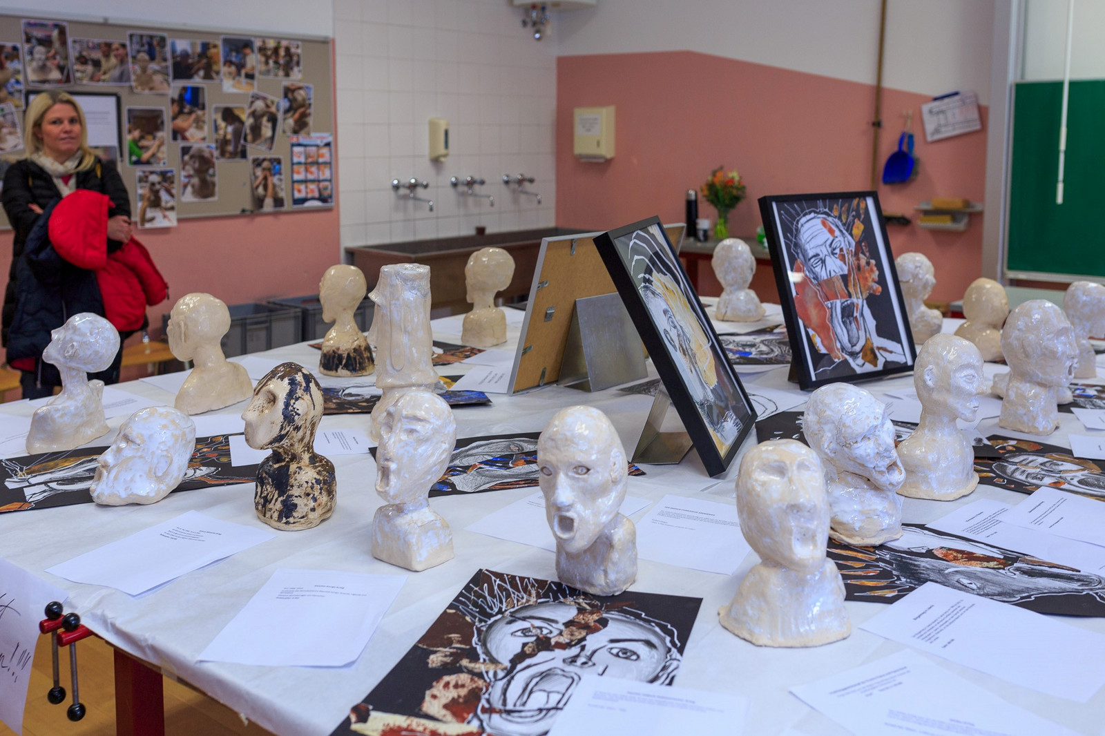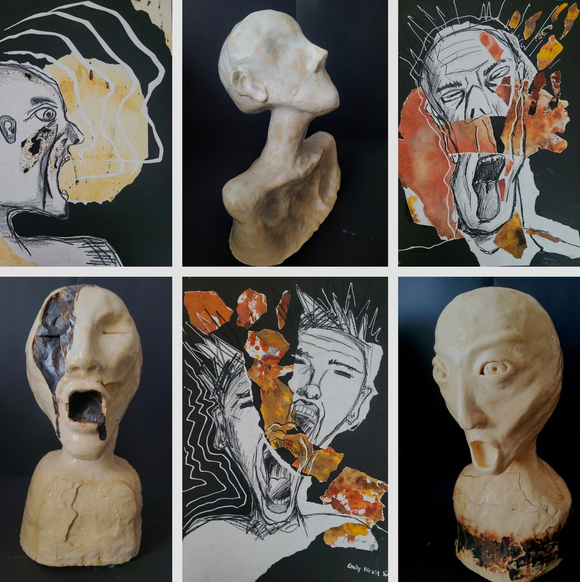 Die 5. Klassen gestalteten dazu „Der Schrei“ von Munch mithilfe der kombinierten Techniken Zeichnung, Décalcomanie- und der Collage-Technik nach. Die 8. Klassen modellierten zu den Themenpools „Krieg, Gewalt, Soziales Engagement und Bildhauerei“ fragile, aber auch ausdrucksstarke, expressive Köpfe aus Ton.
