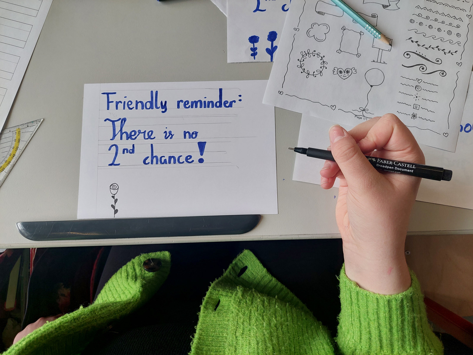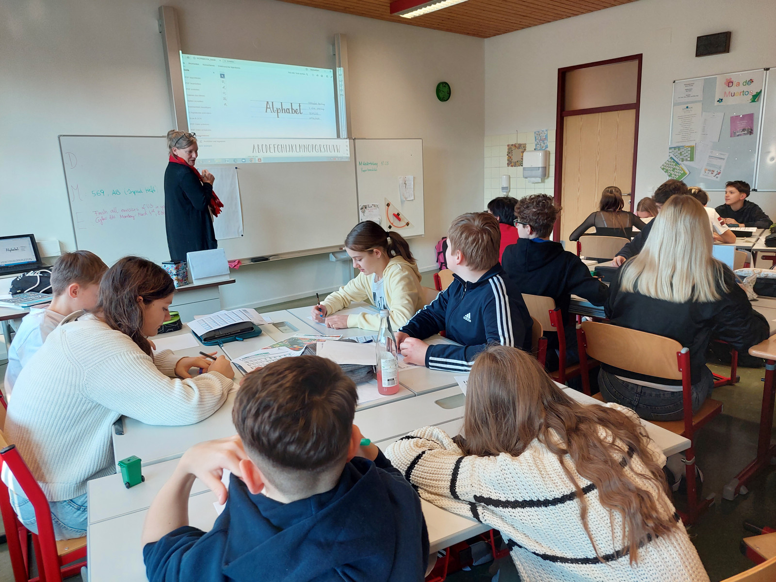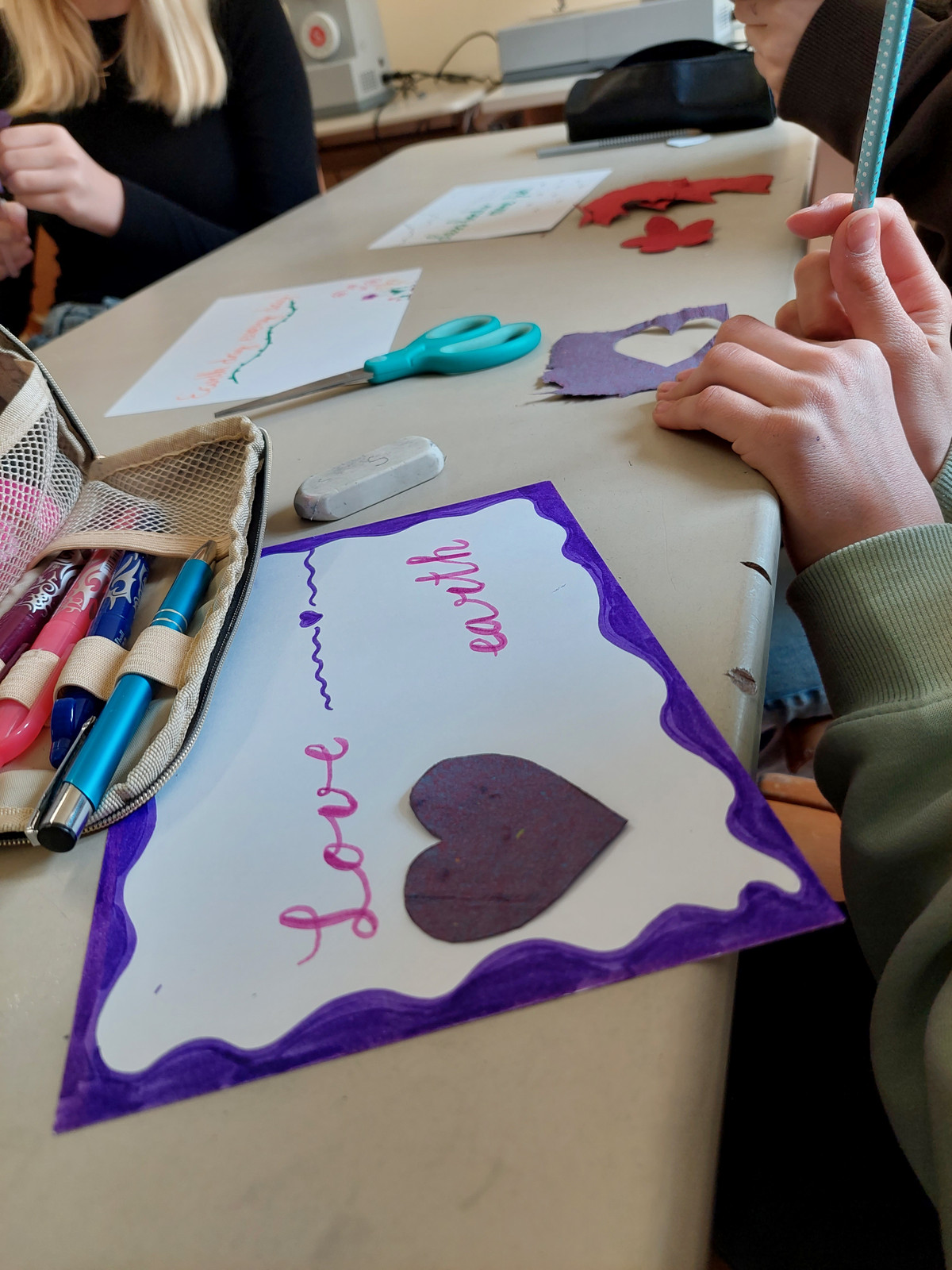 In einem Workshop mit der Künstlerin Inge Hauser experimentierten die Schülerinnen und Schüler mit verschiedenen Schriftstilen, Techniken und Verzierungen. Die erworbenen Fähigkeiten setzten sie anschließend kreativ bei der Gestaltung ihrer Postkarten ein.