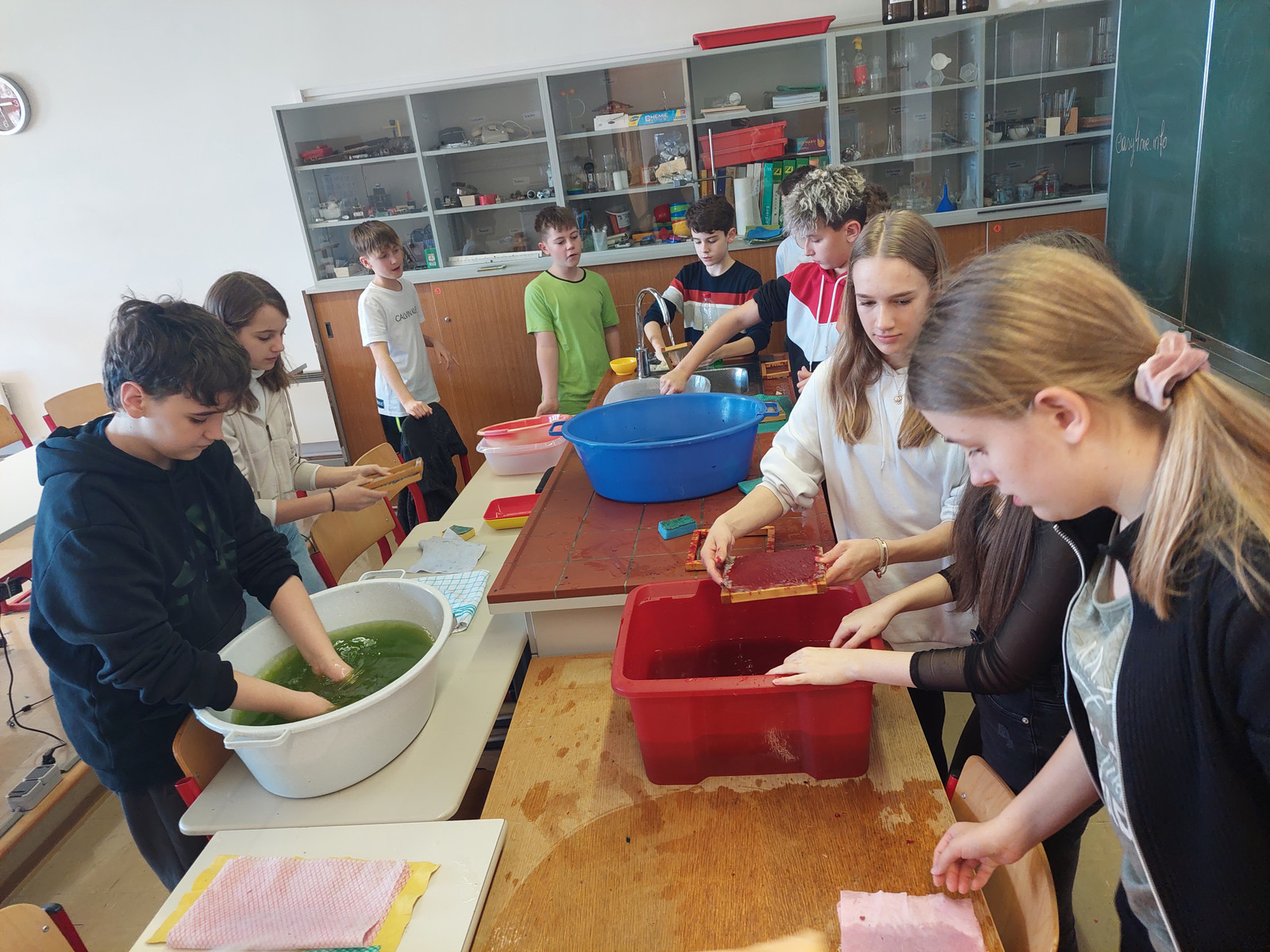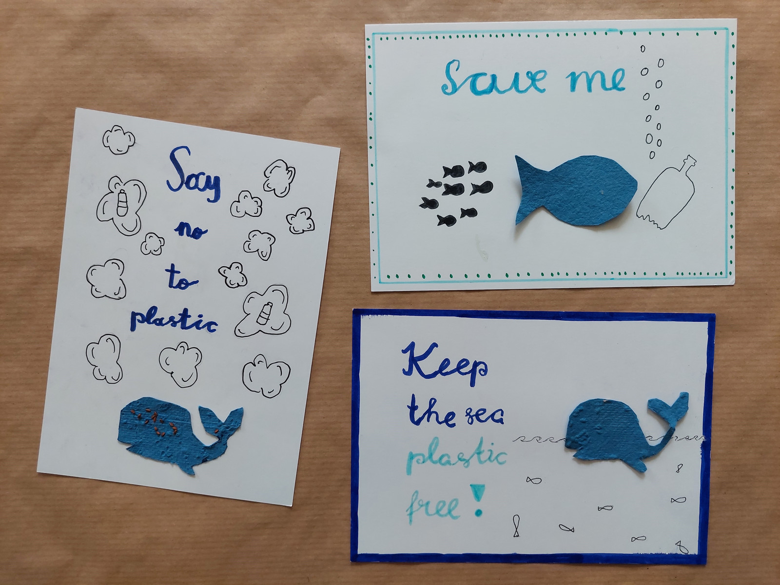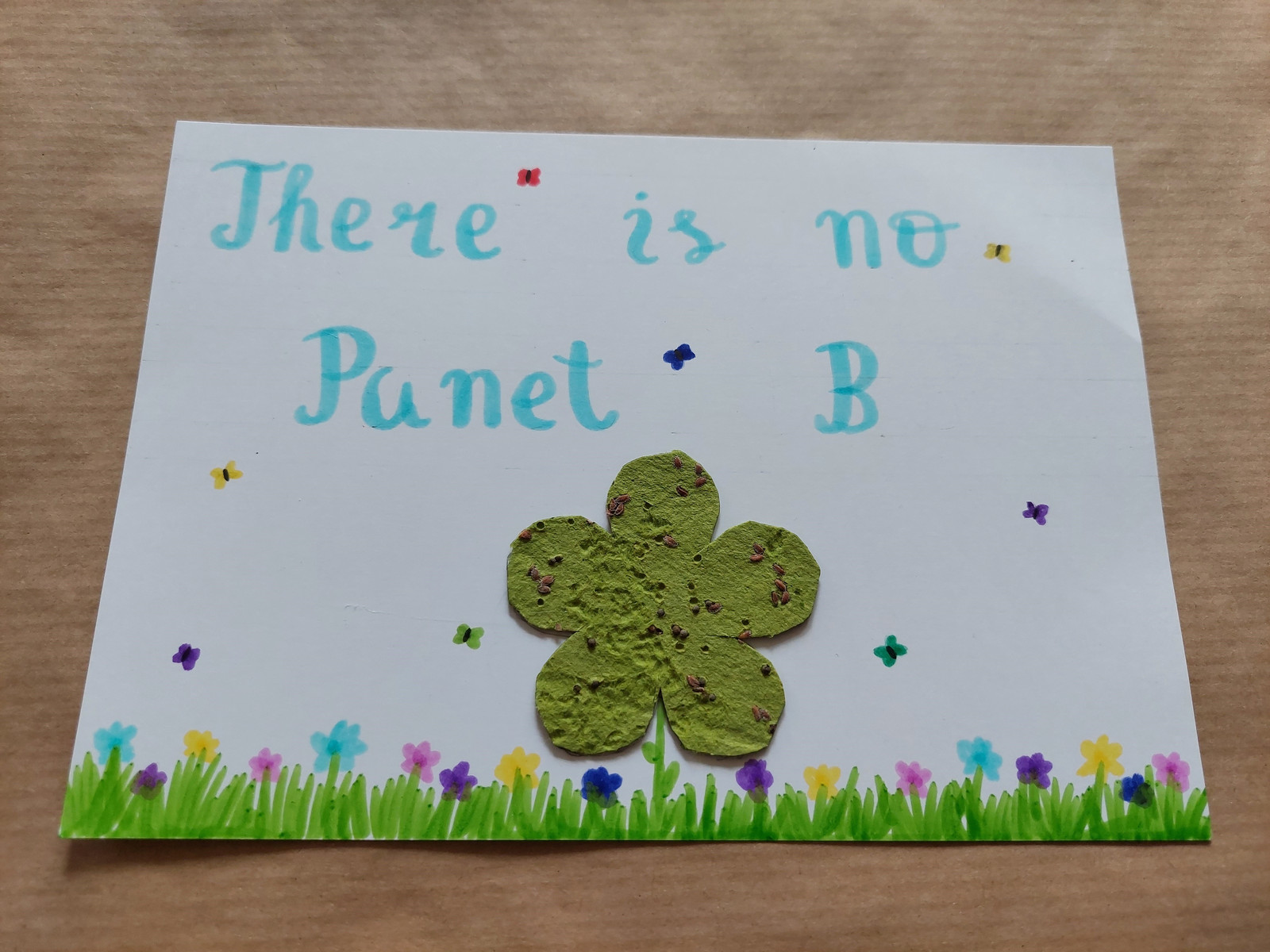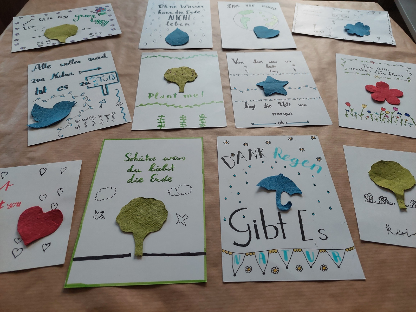 Im Physikunterricht begaben sich die Schüler/innen auf eine Reise durch den Prozess nachhaltiger Papierherstellung. Aus selbst geschöpftem Samenpapier schnitten sie Symbole aus, die ihre Postkarten zierte. Somit verkörperten ihre Postkarten nicht nur inhaltlich, sondern auch materiell den Gedanken der Nachhaltigkeit.