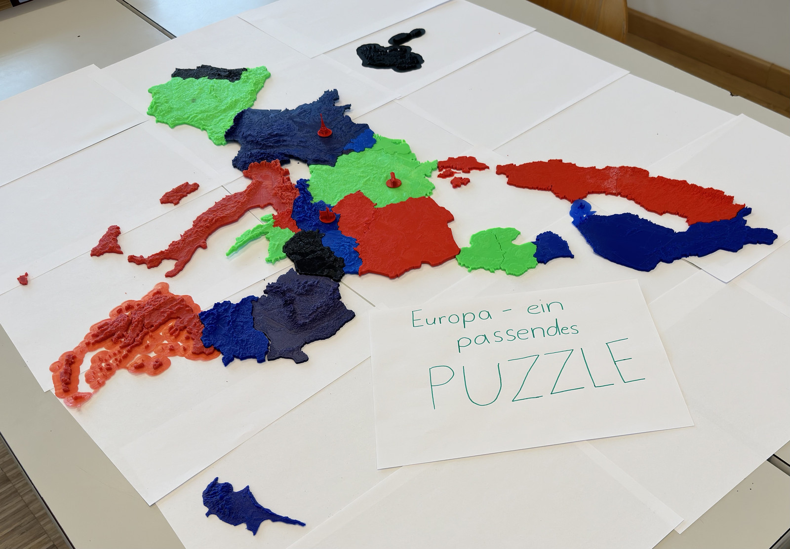 Im Fach Geographie und Wirtschaftskunde entwickelten die Schülerinnen und Schüler ein 3D-Puzzle von den EU-Mitgliedstaaten, dass an den schuleigenen 3D Druckern hergestellt wurde – unter Einsatz von umweltfreundlichem Material, das aus recycelten PET-Flaschen besteht. Zusätzlich kreierten sie zu jedem einzelnen Mitgliedsstaat ein Quiz, dass man auf der Plattform Kahoot spielen kann und dass auf der Rückseite jedes Puzzleteiles mit einem QR-Code versehen, aufgeklebt wurde.