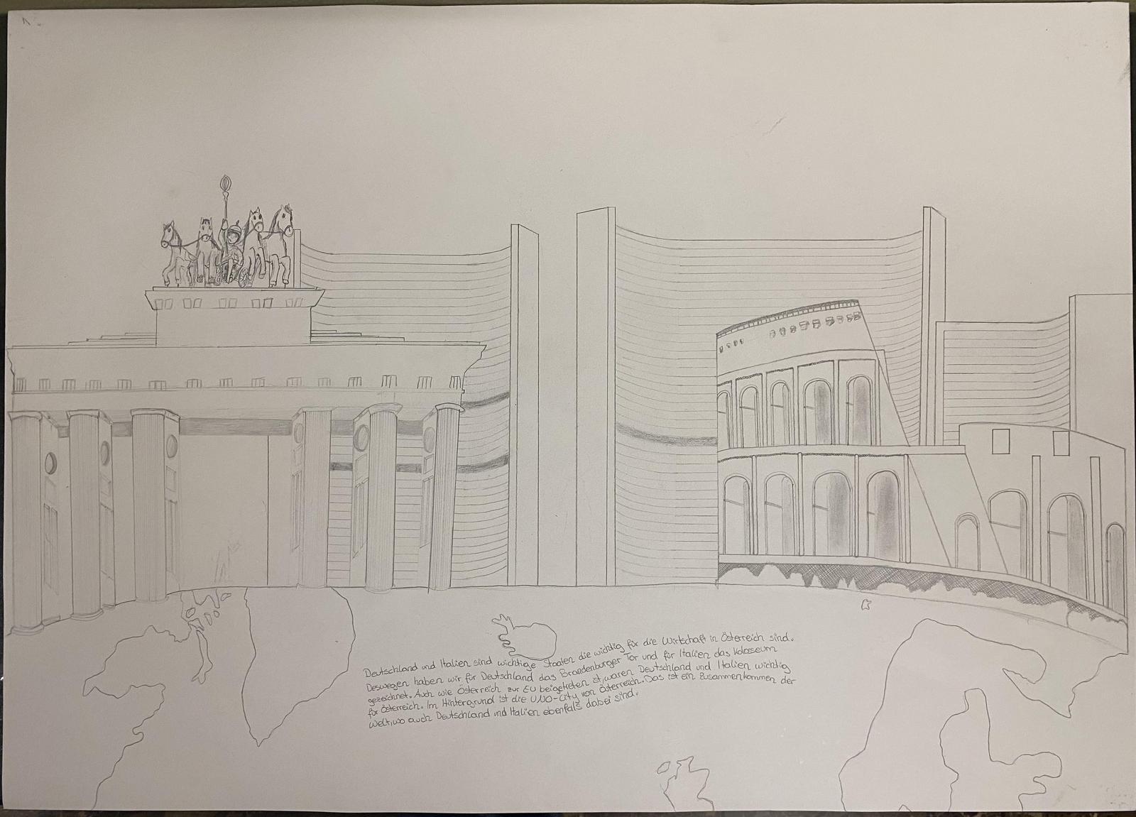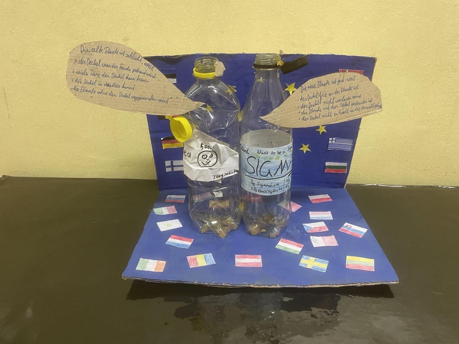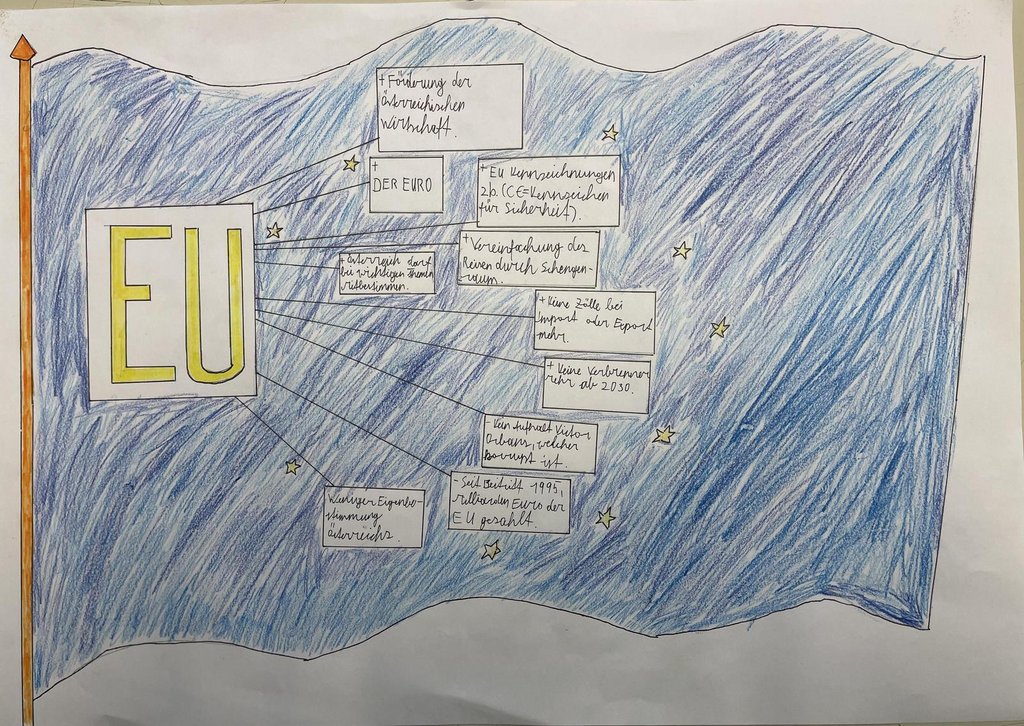 Die Schüler/innen haben sich mit der Stellung Österreichs in der EU auseinandergesetzt. Welche Länder sich aktuell in der EU befinden und welchen Einfluss sie auf Österreich haben, waren weitere Inhalte. Die Stellung der EU in der Weltpolitik und das Zusammenspiel der Nationen wurde beleuchtet und künstlerisch aufgearbeitet. Auf die unmittelbare Gefährdung der Demokratie durch kriegerische Handlungen wurde besonders eingegangen. Außerdem wurden Gesetzte der EU in Bezug auf Nachhaltigkeit in unserem Alltagsleben kritisch hinterfragt und diskutiert.