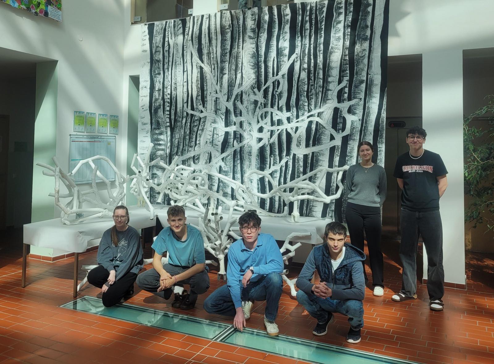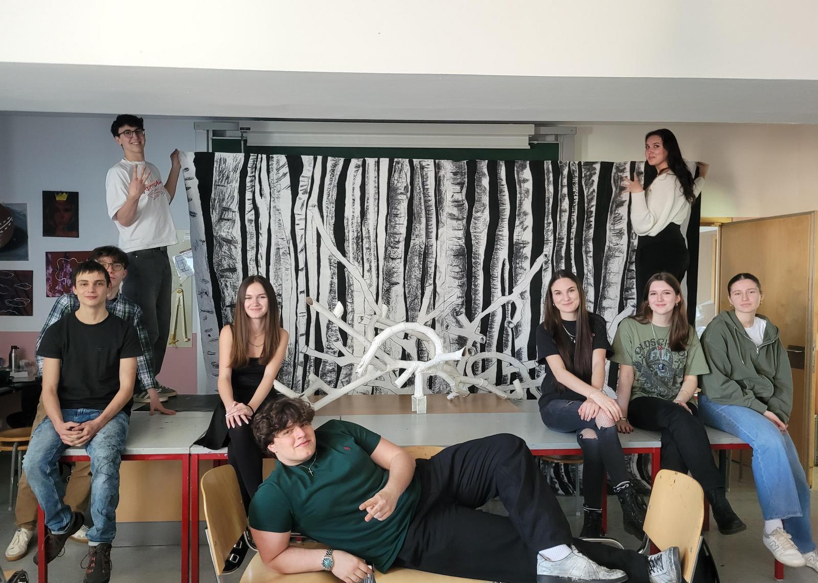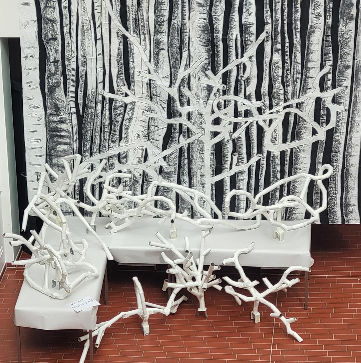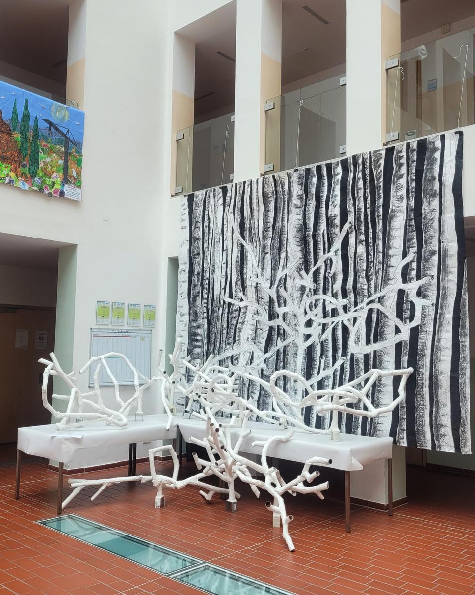 Die 8. Klassen entwickelten das Projekt "Birkenbaum-Wald": Aus Klopapier- und Küchenrollen entstand ein abstrakter, linearer Skulpturenwald vor einem großformatigen schwarz-weißen Hintergrundbild – ein Denkanstoß zu Ressourcenverbrauch und Umweltbewusstsein.