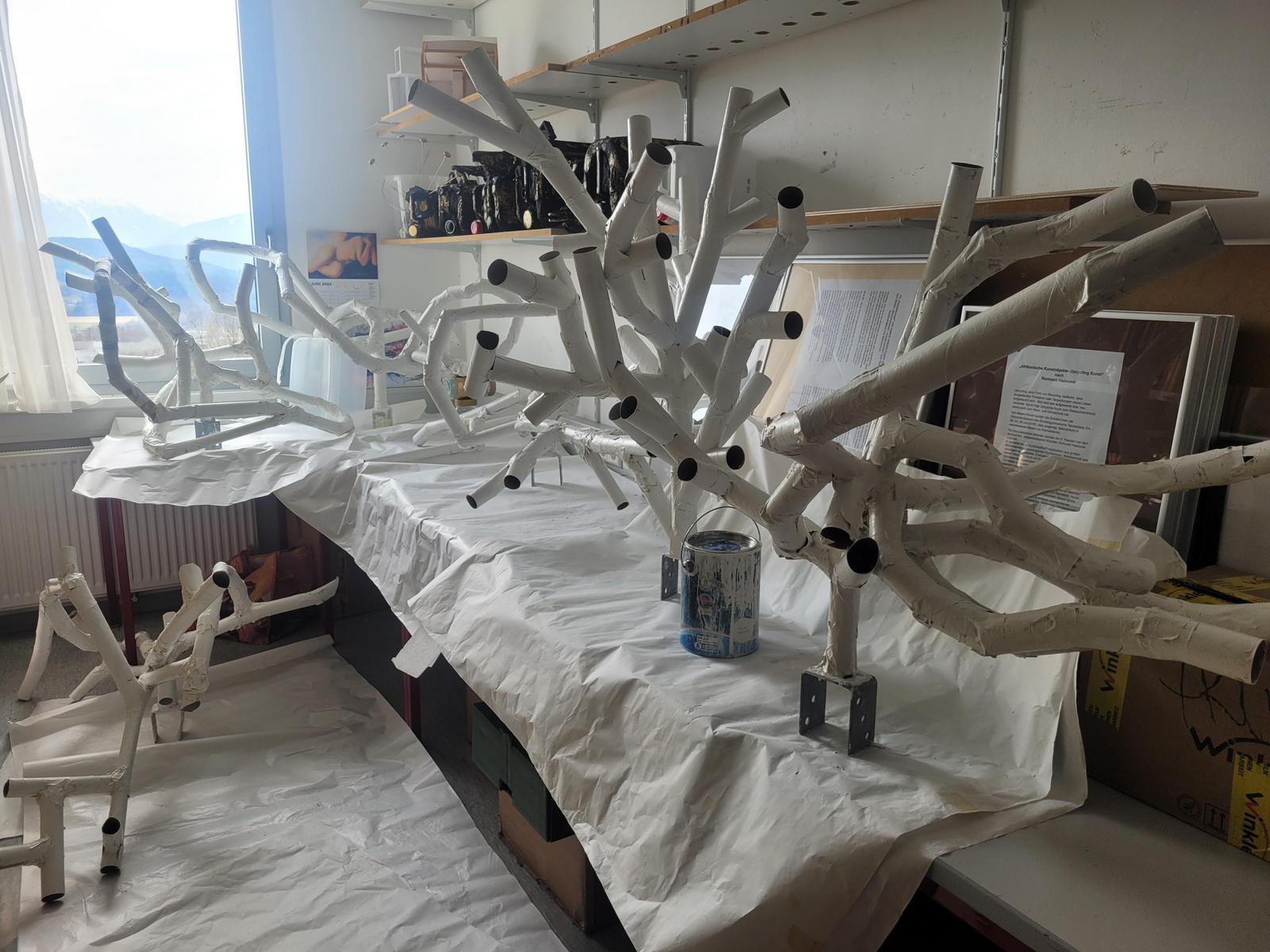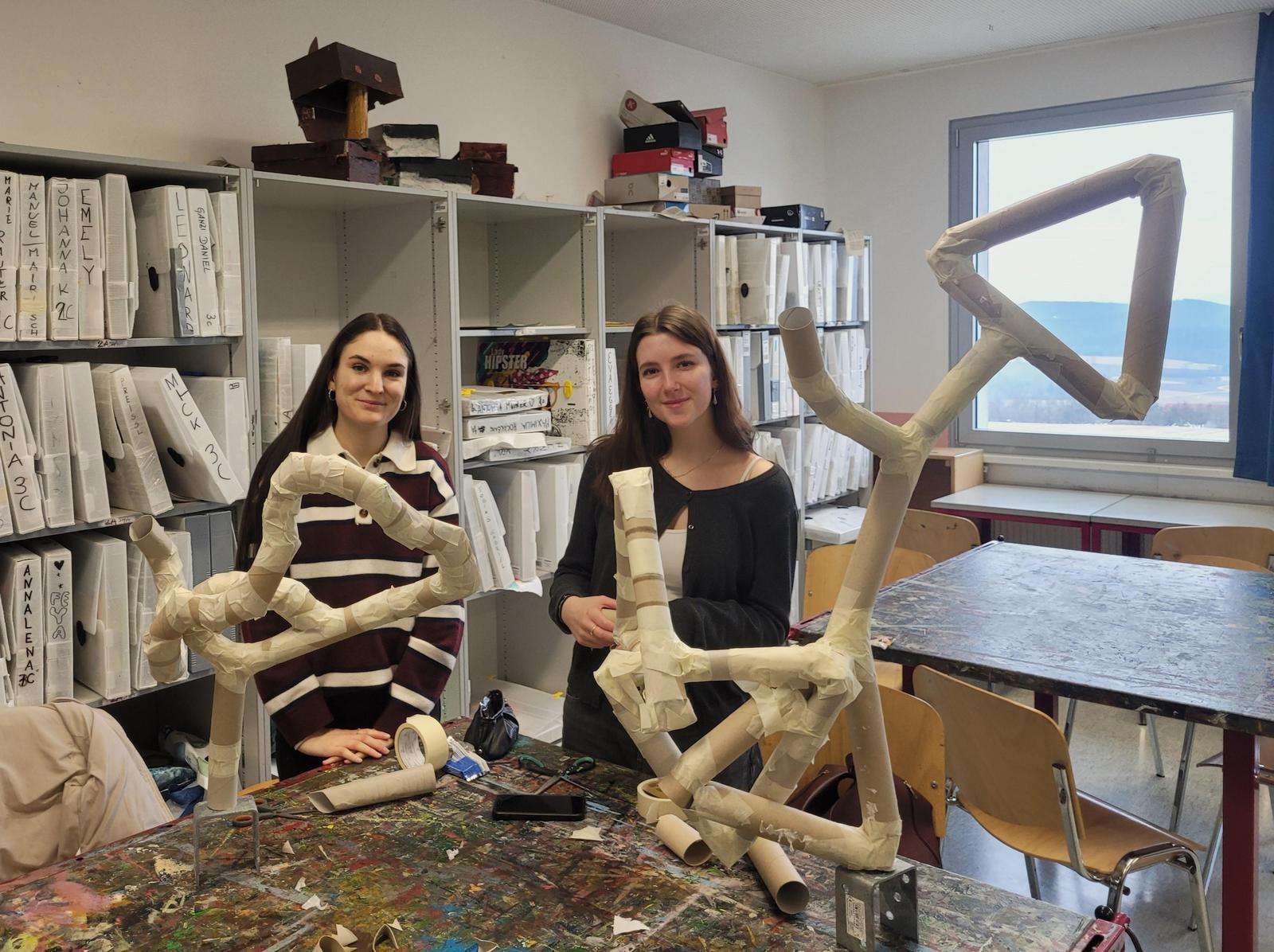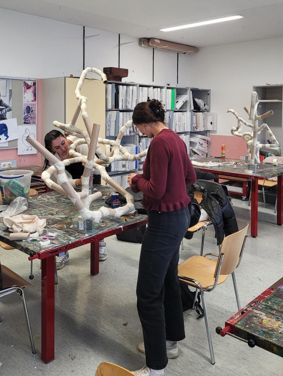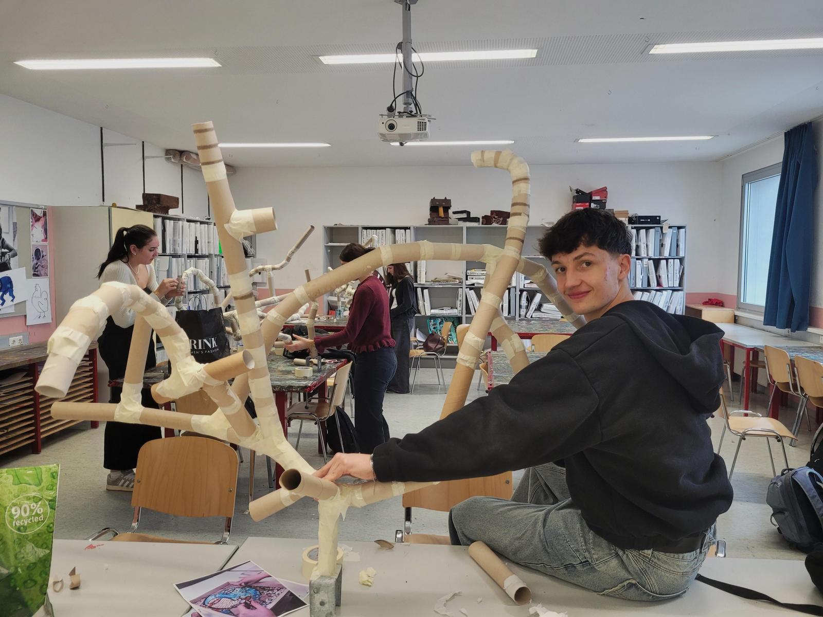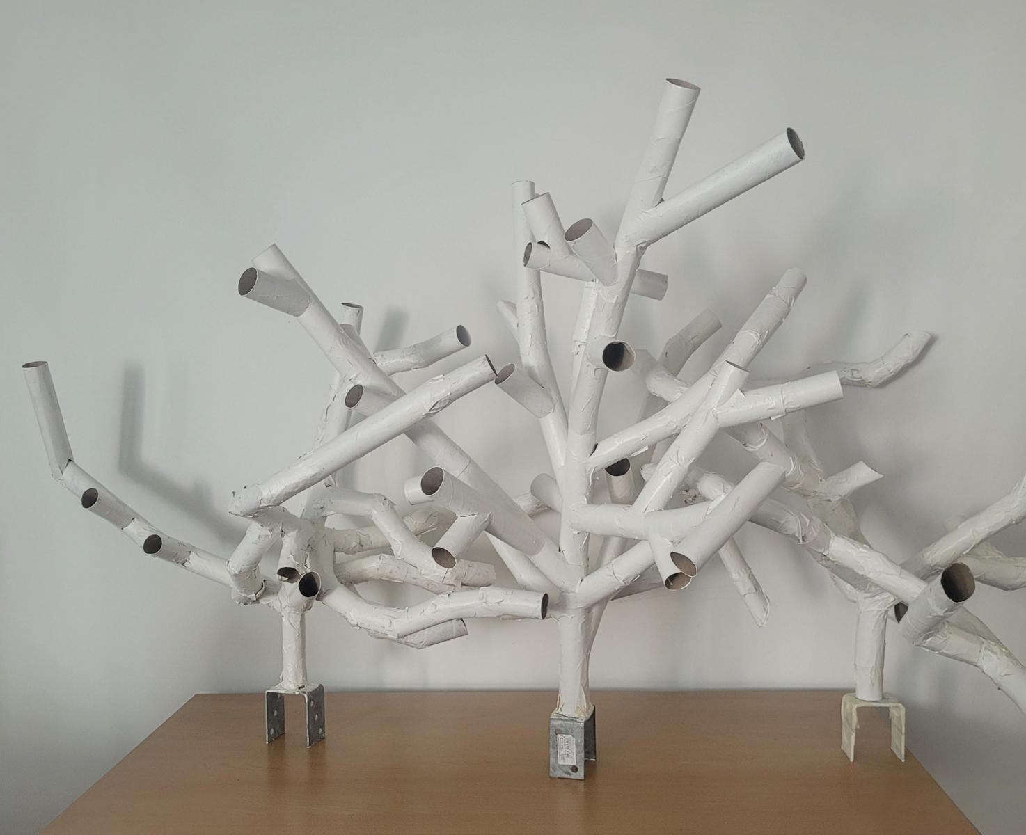 Die 8. Klassen entwickelten das Projekt "Birkenbaum-Wald": Aus Klopapier- und Küchenrollen entstand ein abstrakter, linearer Skulpturenwald vor einem großformatigen schwarz-weißen Hintergrundbild – ein Denkanstoß zu Ressourcenverbrauch und Umweltbewusstsein.