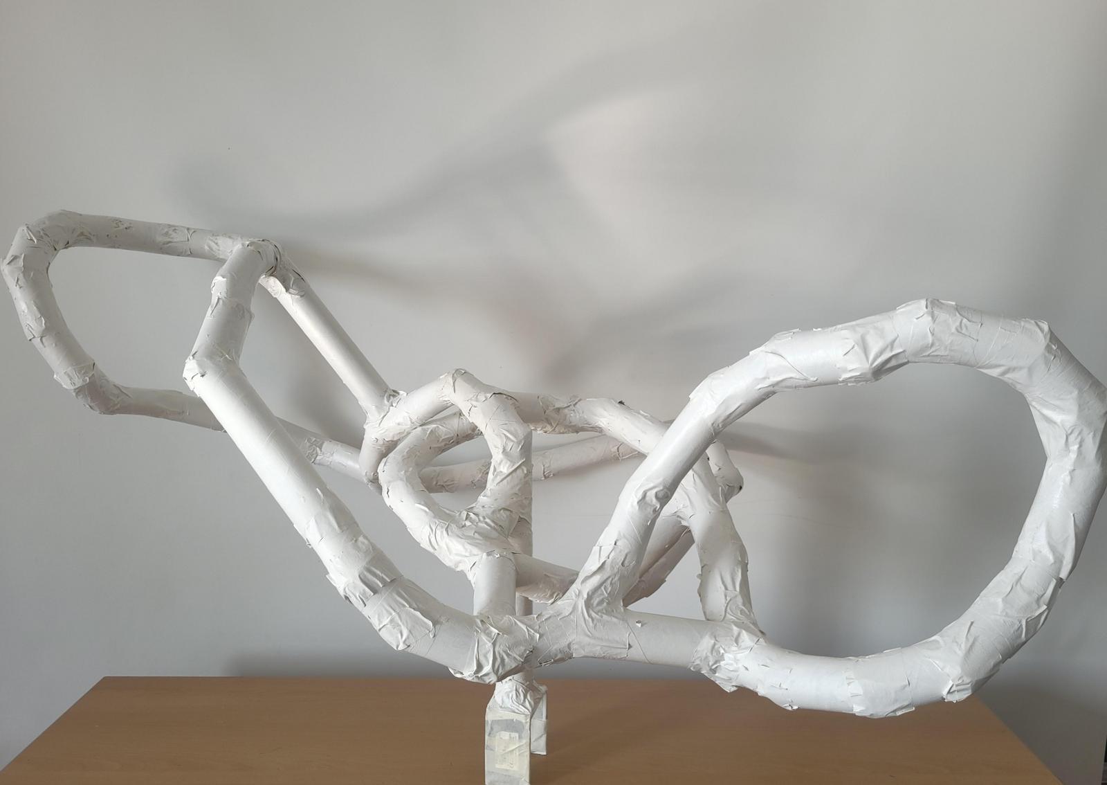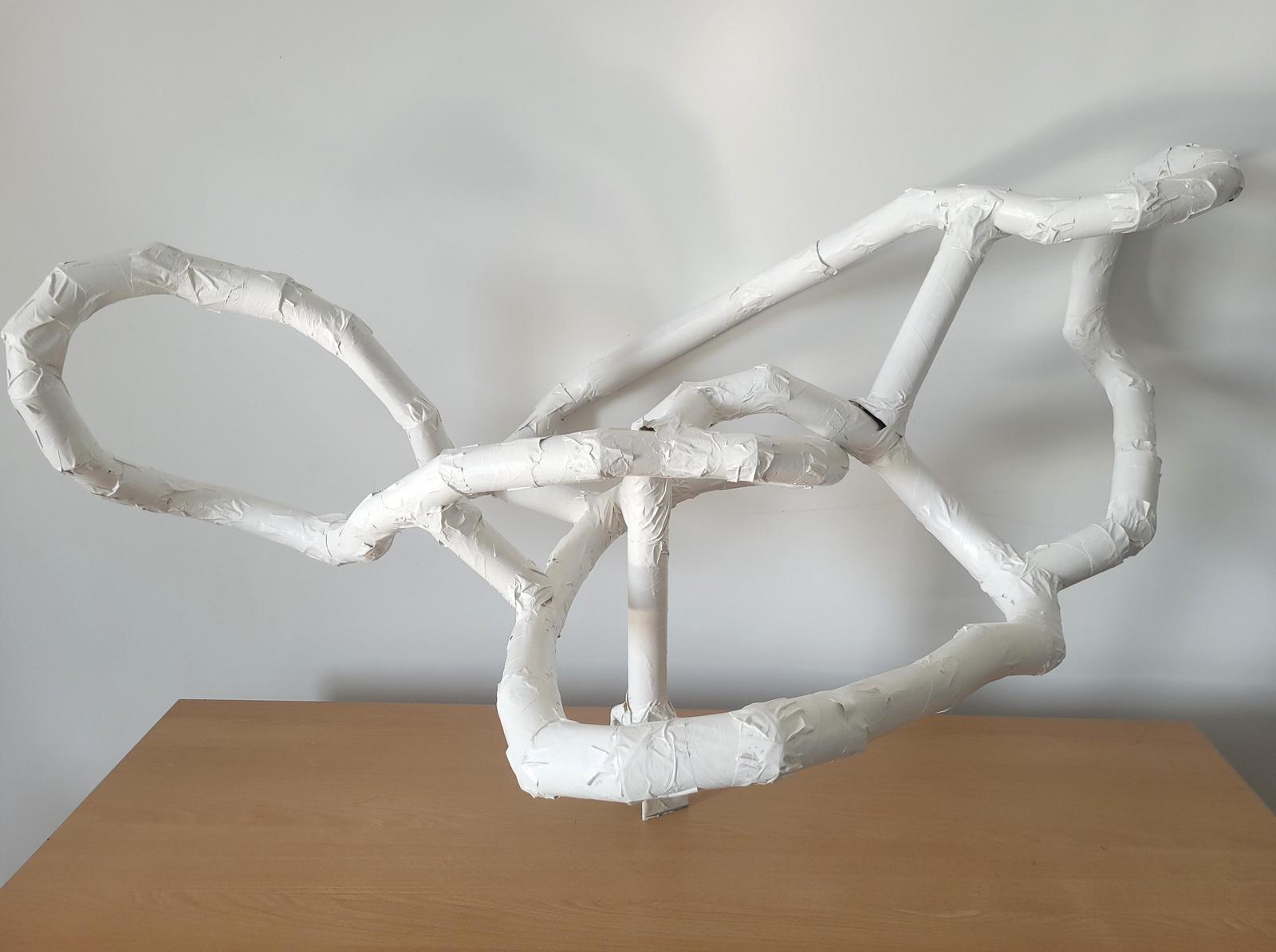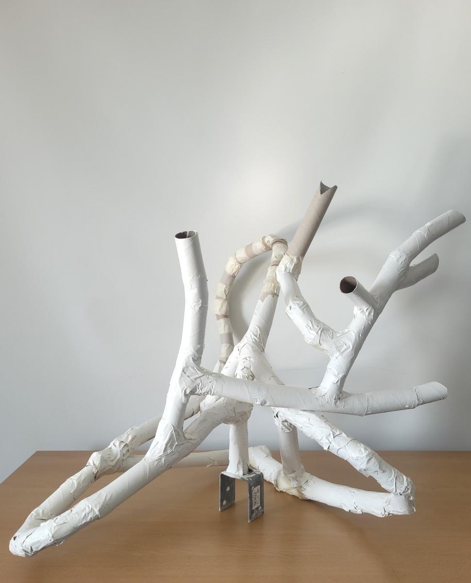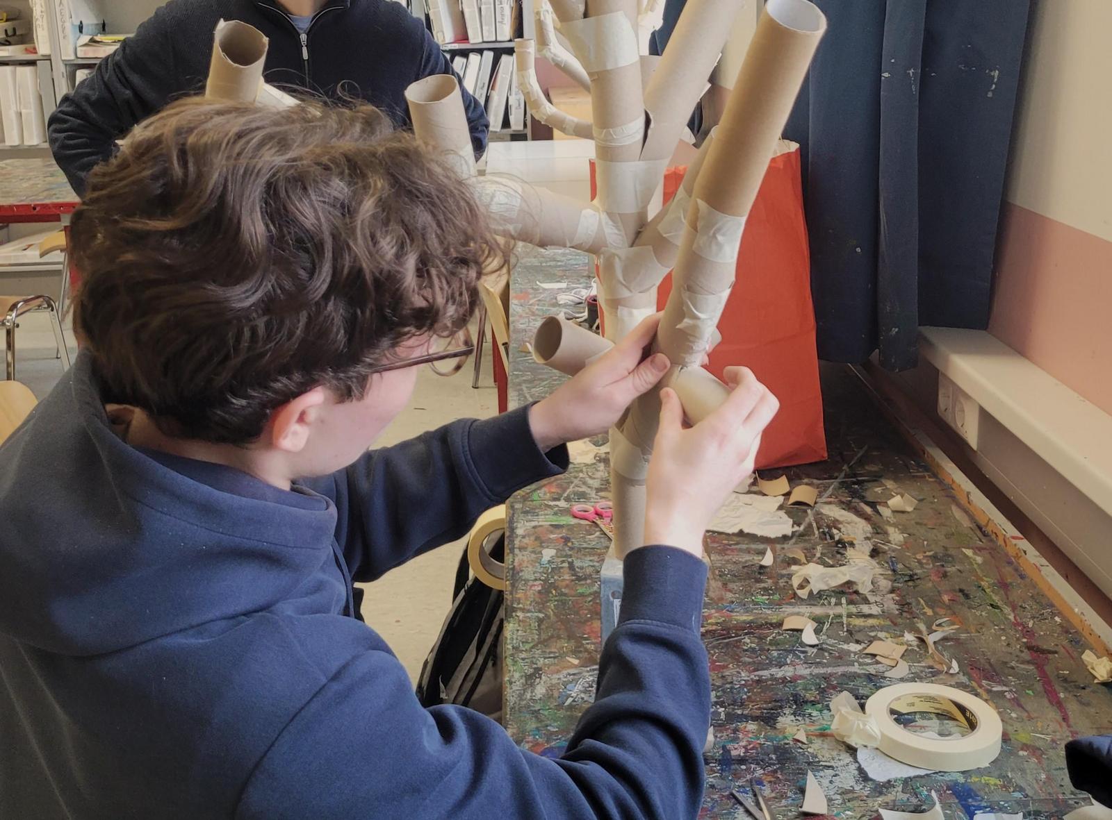 Die 8. Klassen entwickelten das Projekt "Birkenbaum-Wald": Aus Klopapier- und Küchenrollen entstand ein abstrakter, linearer Skulpturenwald vor einem großformatigen schwarz-weißen Hintergrundbild – ein Denkanstoß zu Ressourcenverbrauch und Umweltbewusstsein.