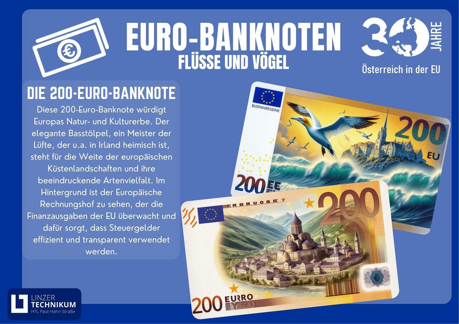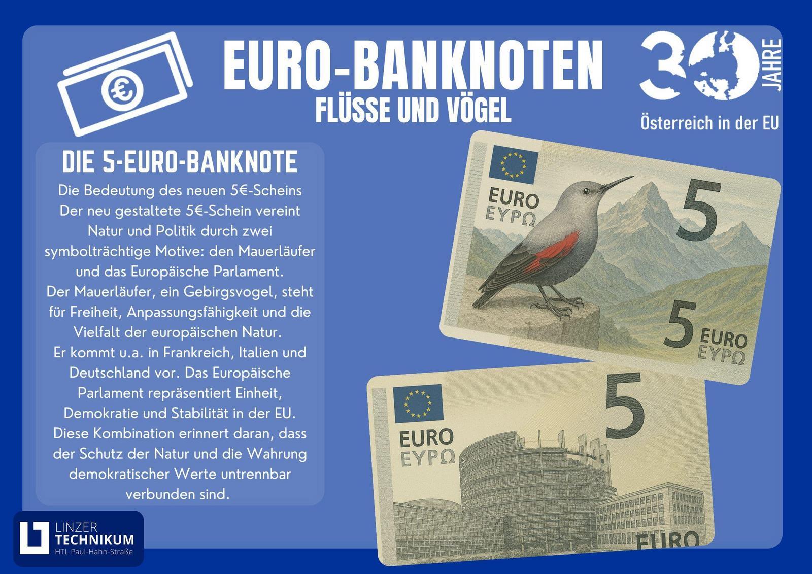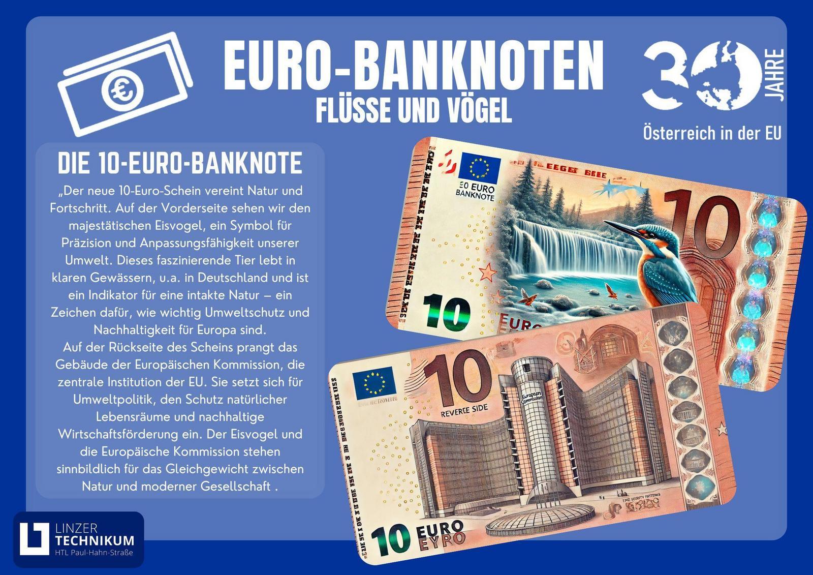 Unsere Klasse bereitet für den Europatag am 9. Mai 2025 eine interaktive Ausstellung an der Schule zum Thema "Der Euro – mehr als nur eine Währung" vor. Ausgangspunkt war die Initiative der Europäischen Zentralbank zur Neugestaltung der Euro-Banknoten. Zur Auswahl standen die Themen "Europäische Kultur" sowie "Flüsse und Vögel", über deren endgültiges Design der EZB-Rat voraussichtlich 2026 entscheidet. Inspiriert davon haben die Schülerinnen und Schüler mit KI-Tools eigene Banknoten-Entwürfe gestaltet sowie mit Grafikprogrammen wie Canva, mit dem in Teamarbeit simultan die Entwürfe bearbeitet wurden.
