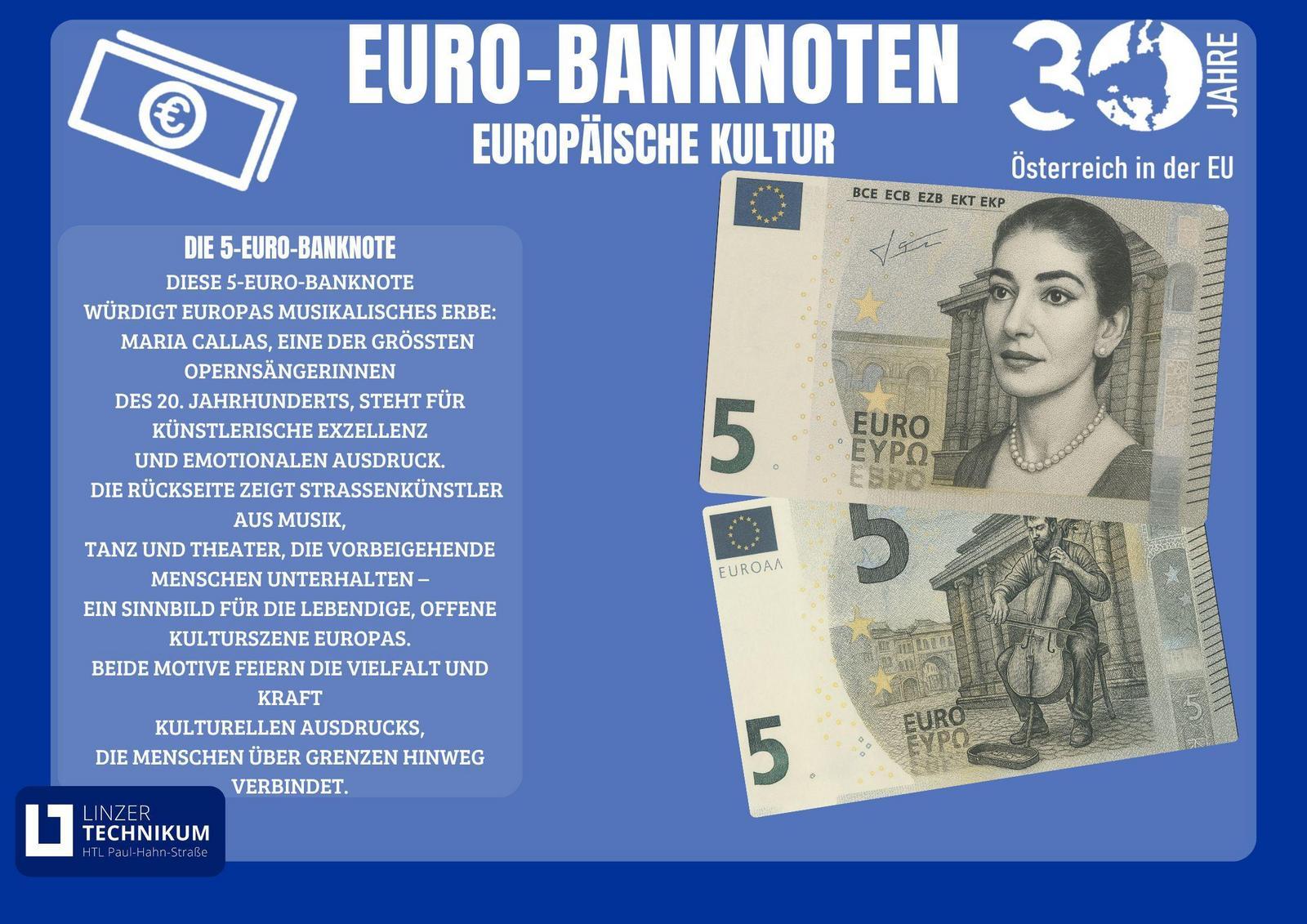 Die Ausstellung umfasst 14 Stationen mit A2-Schautafeln. Zwölf davon zeigen Vorder- und Rückseiten der gestalteten Banknoten sowie QR-Codes zu kurzen Videos (ca. 30 Sek.) mit Voiceover, Musik und Untertiteln. Eine Einführungsstation liefert Zahlen, Fakten und ein Einführungsvideo zur Geschichte und Bedeutung des Euro. Die Abschlussstation bietet ein interaktives Quiz. Die Besucher/innen können alle Inhalte individuell mit Smartphone und Kopfhörern erleben. Ziel ist es, Kreativität, Medienkompetenz und europäisches Bewusstsein zu fördern – und den Euro als Symbol für Vielfalt und die Einheit Europas sichtbar zu machen. Das Arbeiten mit KI-Tools soll im Sinne einer zukunftsorientierten Bildung der unaufhaltsamen Entwicklung in diesem Bereich Rechnung tragen.