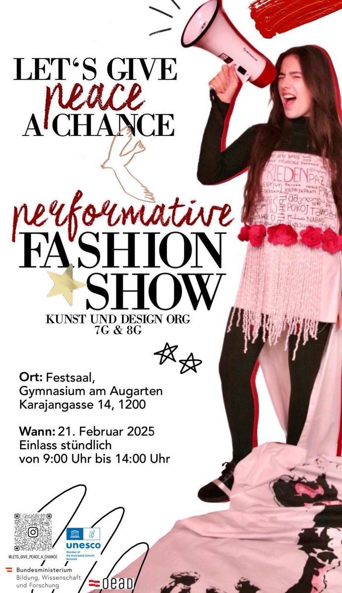 Parallel dazu wurde im Fach Projektmanagement die Modenschau geplant, während in BGW-Plakate und Broschüren gestaltet wurden. In KuG entstanden Fotografien im Demonstrationsstil sowie Modeaufnahmen bei einem professionellen Shooting. Ergänzt wurde das Projekt durch 2 Videos: eines mit Fokus auf den Outfits und ihren Botschaften, das andere thematisierte Zusammenhalt, Gleichberechtigung und Frieden. Abschließend wurde eine passende Choreografie für Walk und Performance entwickelt.